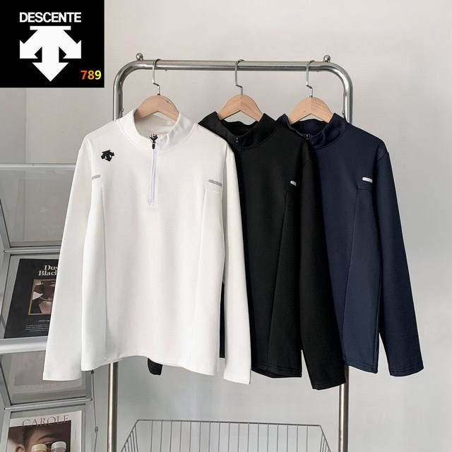 Descente New Arrival! Stand Collar Half-Zip Sports Base Layer Long-Sleeve T-Shirt Outdoor Casual Shirt. The stand collar and half-zip design is very versatile, suitable for business, casual, and sports occasions. The technical fabric has highly efficient breathability, moisture-wicking properties, and is both crisp and soft. The three-dimensional cut perfectly shapes the body. The front and back 3M reflective strips add a touch of simplicity and style while also increasing safety during nighttime activities. Excellent value for money. Colors: Black, White, Navy Blue.