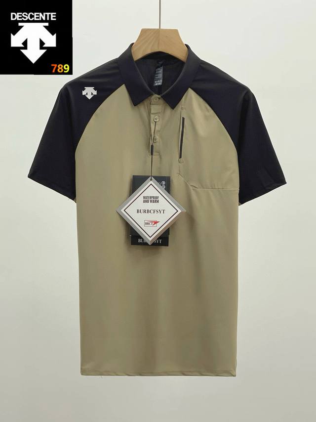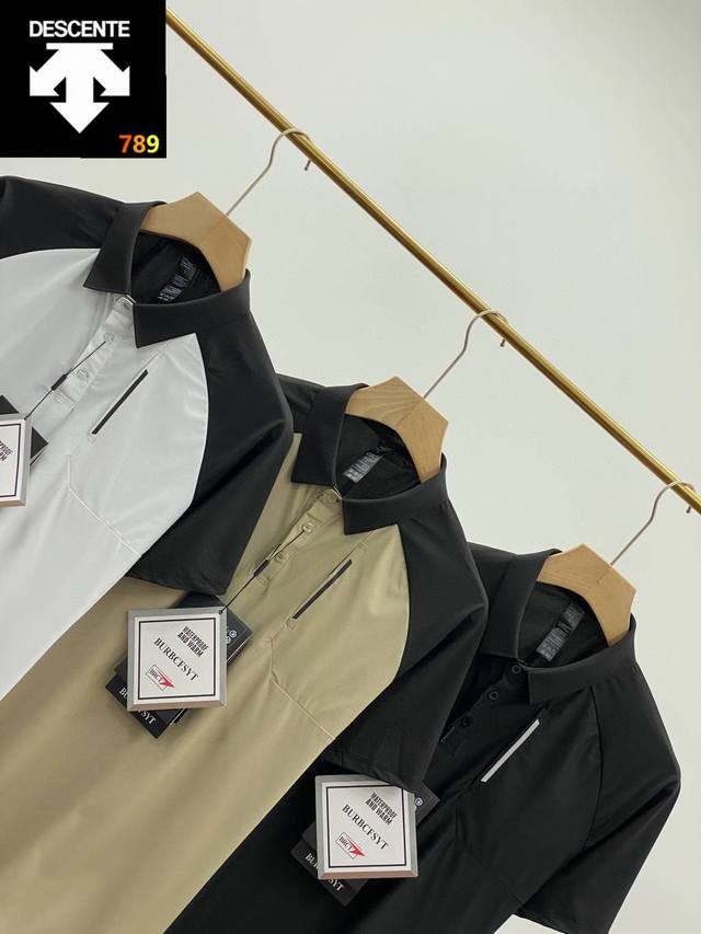 Descente's 2025 Summer New Men's Stand Collar Simple Polo Shirt Short Sleeve T-Shirt. Made with imported Korean ice silk quick-drying fabric, this super comfortable fabric feels cool and refreshing to wear. Features a three-dimensional cut, raglan shoulder design, and a heat-sealed back panel. Available in understated pure black, black with white, and black with khaki