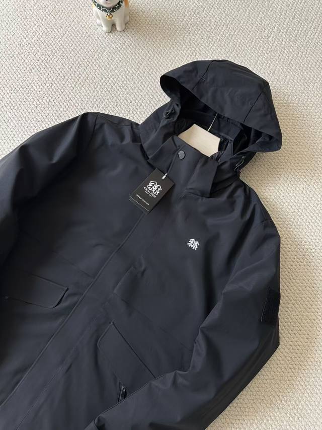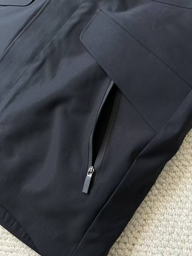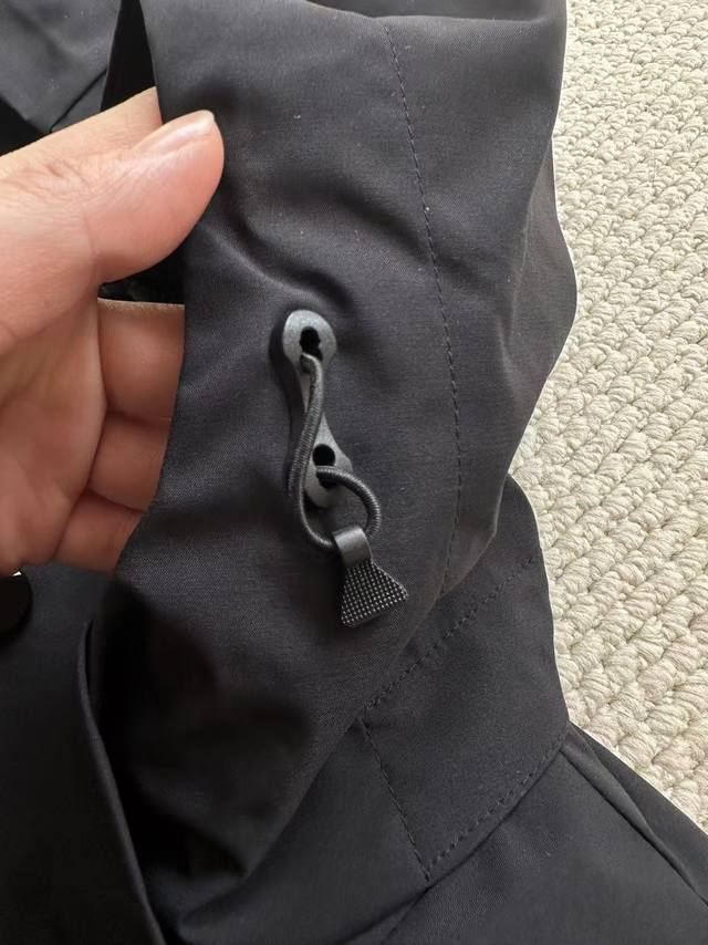 jacket has a fully seam-sealed lining, a very complex process. It's paired with a 750-fill-power 90% white duck down jacket. The down jacket boasts high loft and is filled with 90% white duck down, making it lightweight and warm. It features internal snap closures, ensuring a snug, warm, and not bulky fit.