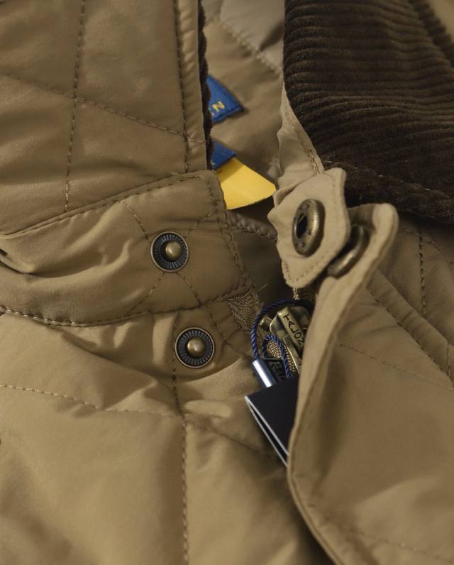 's buttons are custom-made with metal snaps with clear logo engraving, adding a touch of elegance. The garment's lines are sleek, refined, and stylish. The fabric, which prevents lint from escaping, locks in warmth and offers a doubled soft feel.
