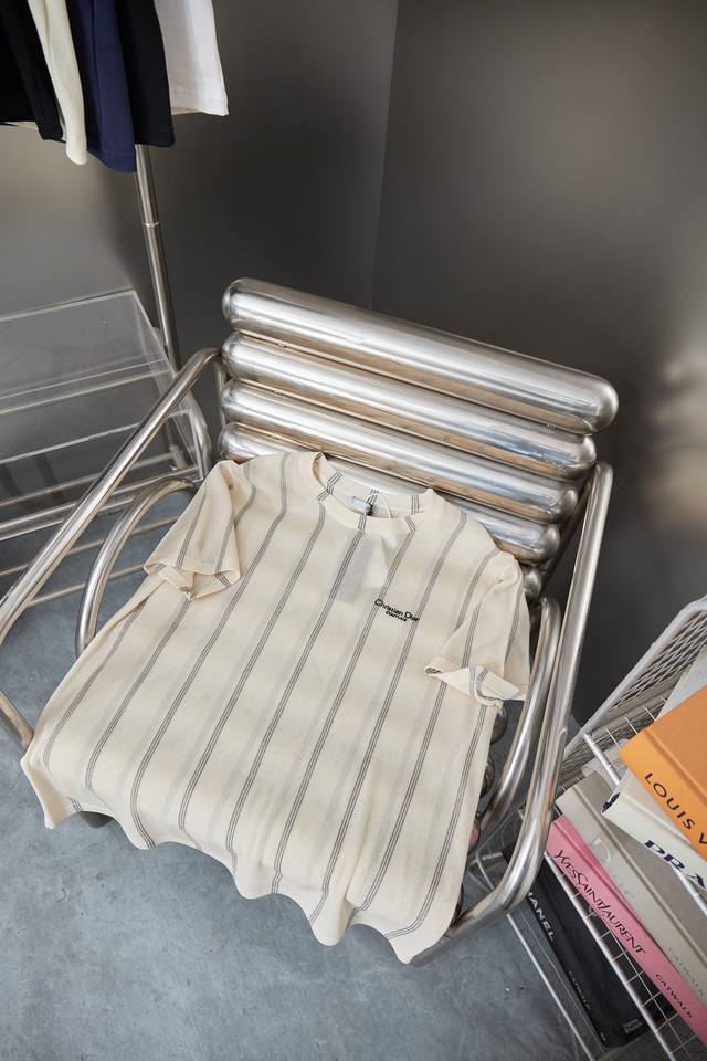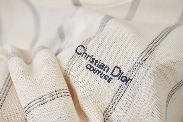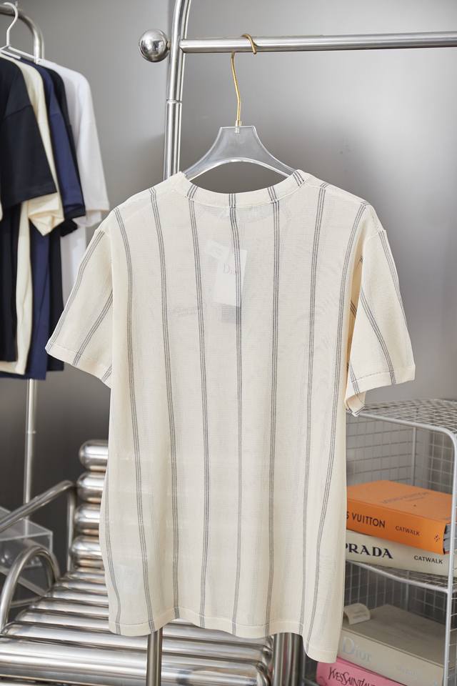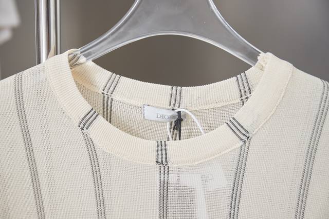 Di0R Loose Fit T-Shirt Ddd Beige Striped Cotton and Linen Blend Plain Knit Fabric Christian Di0R Couture Embroidery Ddd This Christian Di0R Couture T-Shirt is a new addition to the Fall 2025 menswear collection, embodying a summery feel. Lightweight and crafted from a beige striped cotton and linen blend plain knit fabric, it's adorned with the classic Christian Di0R Couture logo for added style. A classic design that pairs well with shorts from the collection. Ddd Christian Di0R Couture Embroidery Ddd Crew Neck Ddd 70% Cotton, 30% Linen Ddd SML XL DDD