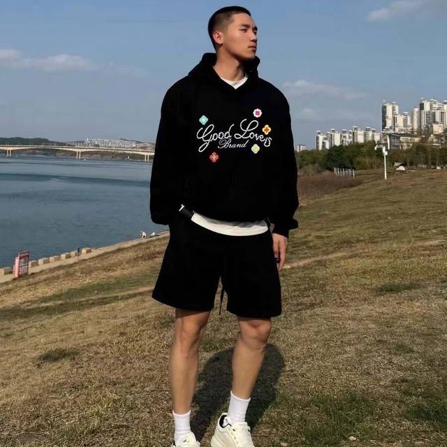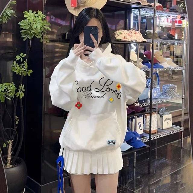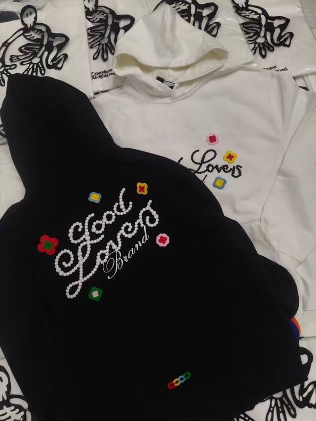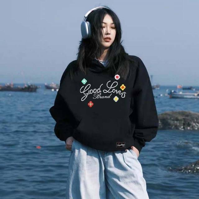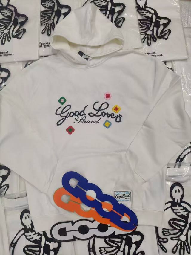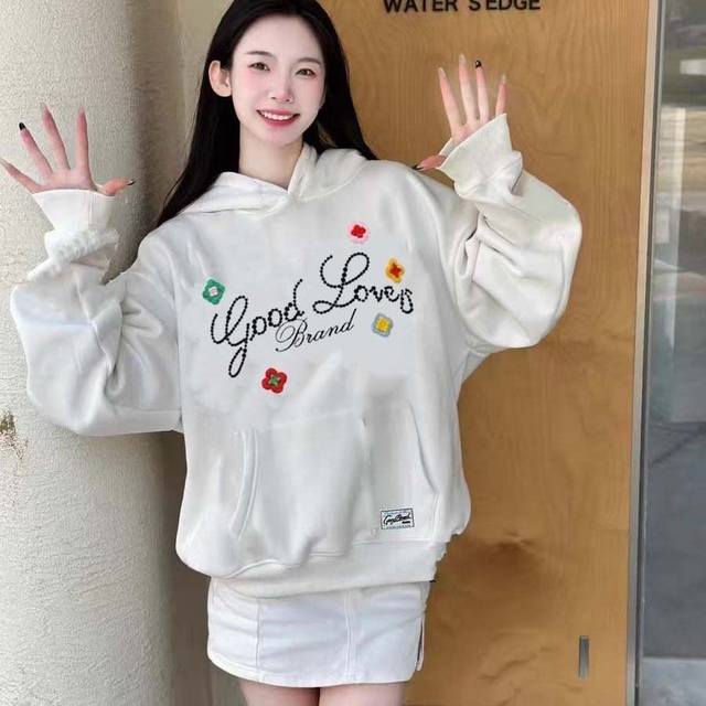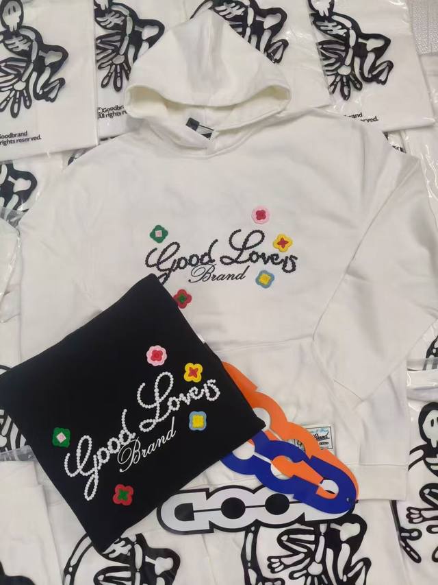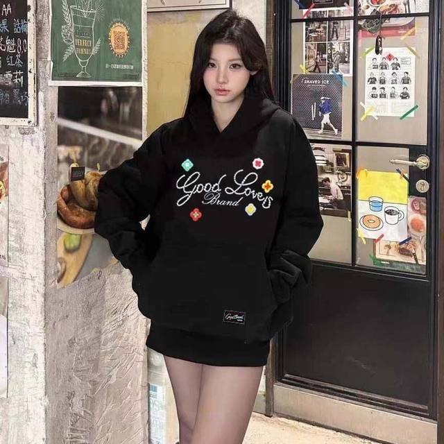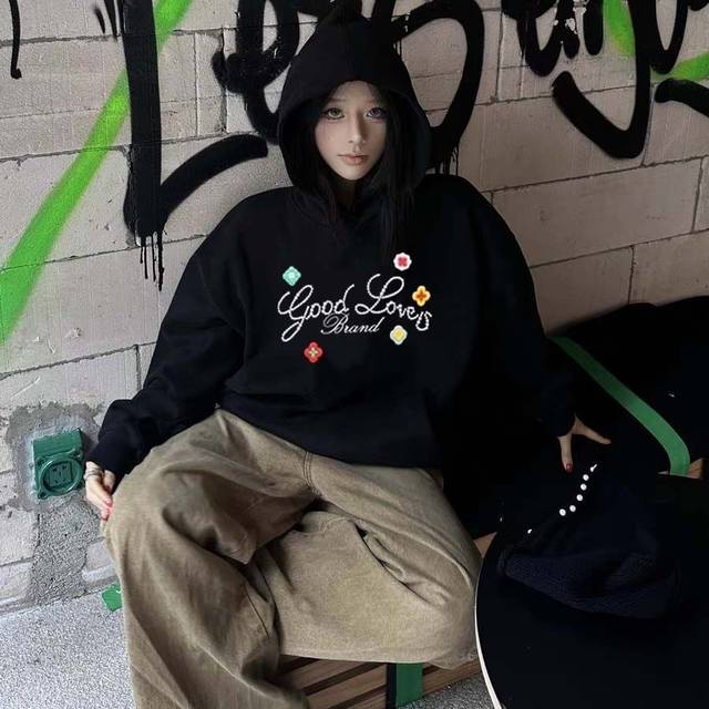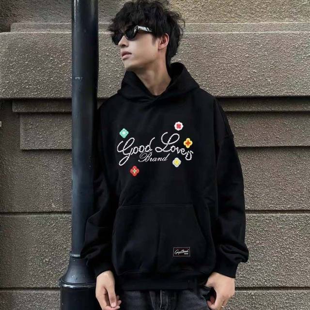 Discounts available for bulk orders. Goodbrand 3D slogan embroidered flower and letter hoodie, unisex style. Quality, weight, fabric, custom three-label fit. Sizes: S-XL.
