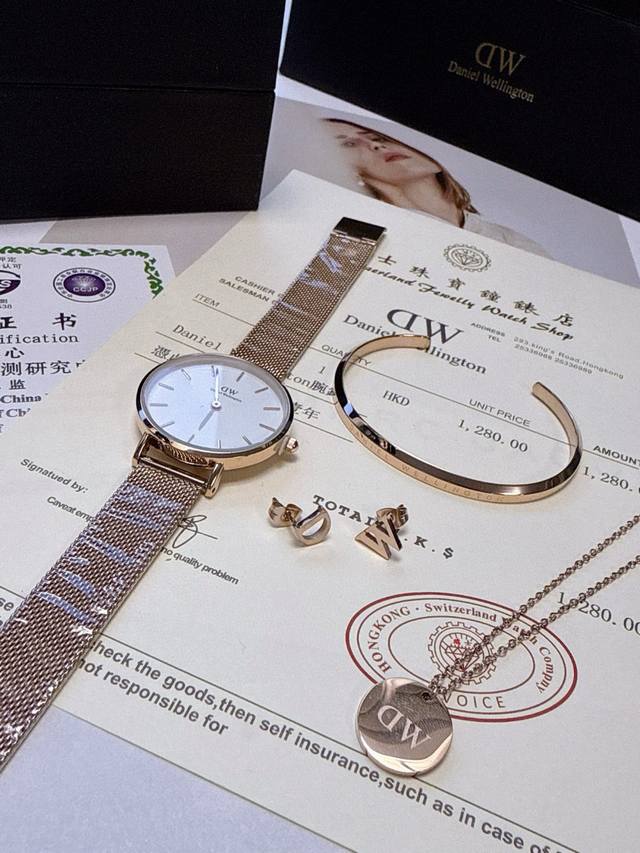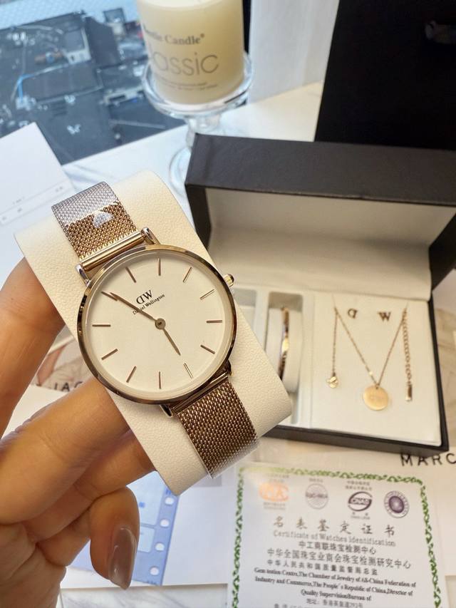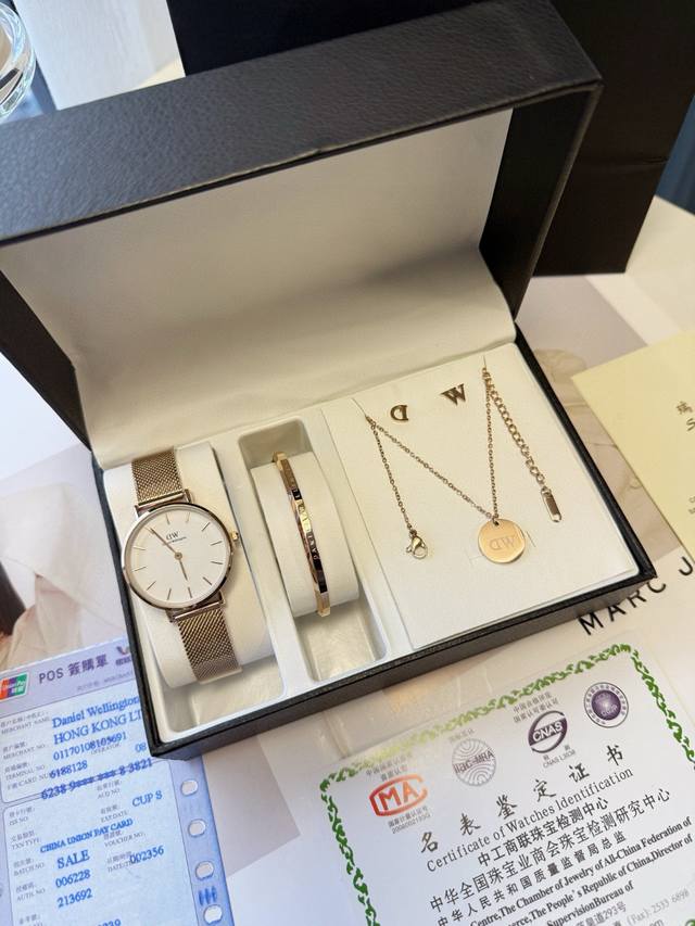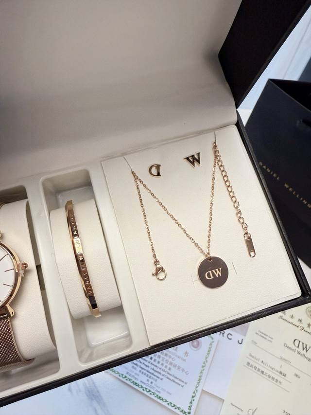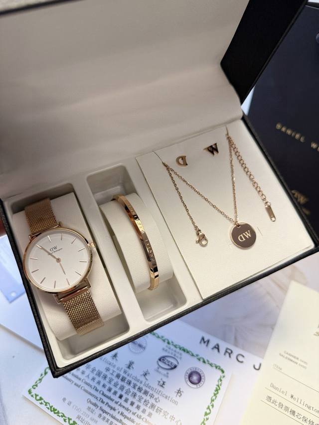 Dw watch four-piece set gold and white brand new original authentic Dw four-piece watch Dw bracelet set box. New Year's heavy launch of high-end customized Daniel Wellington Classic women's four-piece set brilliant life journey Dw classic works perfectly interpret the impeccable charming style! Set includes: simple and fashionable quartz women's watch Dw bracelet + earrings + Dw round necklace full set gift box packaging
