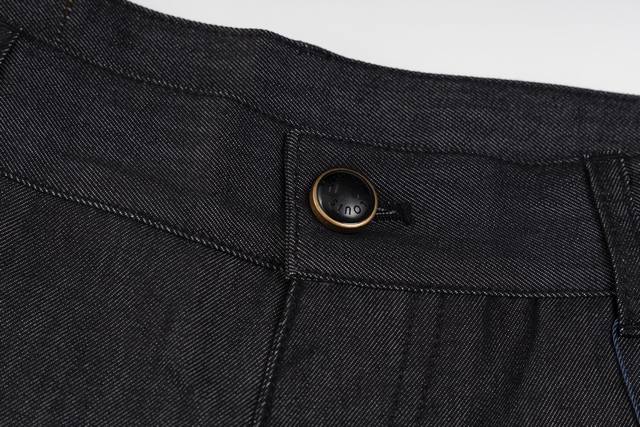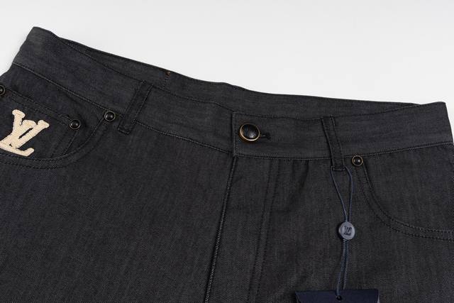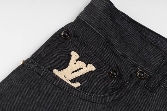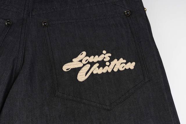 Fabric is made of custom comfortable cotton fabric, letter and handwritten brand logo, decorative ticket pocket and back pocket, Der nubuck leather label, pearl rivet rich details, classic five-pocket jeans tailoring, front and back embroidered logo.
