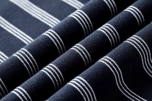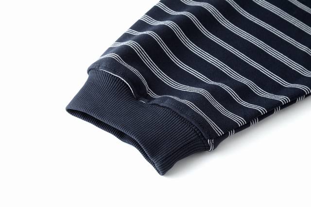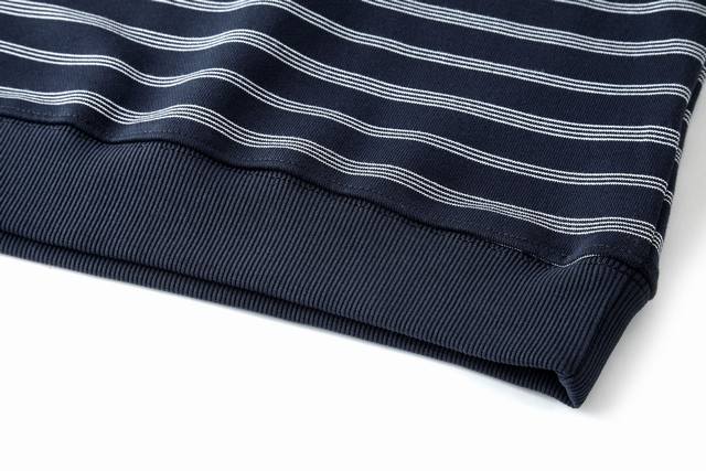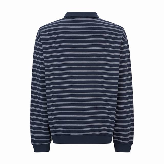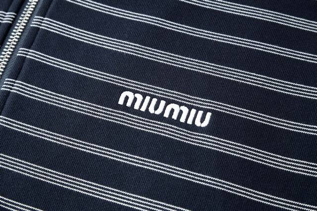Exclusive Supply: Ddd Miumiu Striped Half-Zip Long-Sleeve Polo Shirt. Original design purchased for 14,700 and developed using 60-count mercerized cotton fabric with custom-woven striped jacquard. Ribbed fabric is paired with 420g matching mercerized rib. The entire garment requires alignment during the cutting process, resulting in very high waste