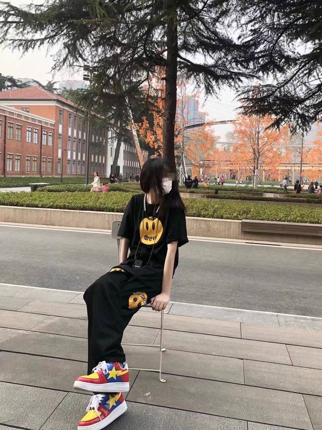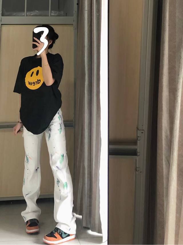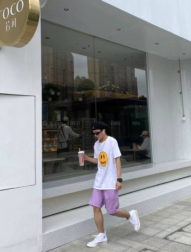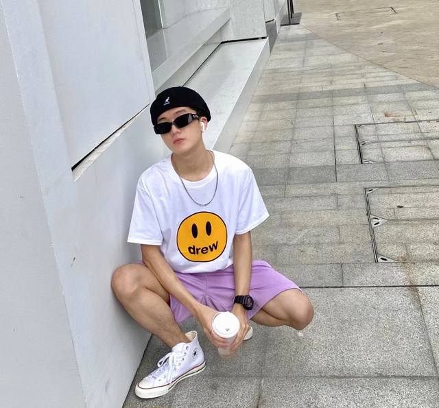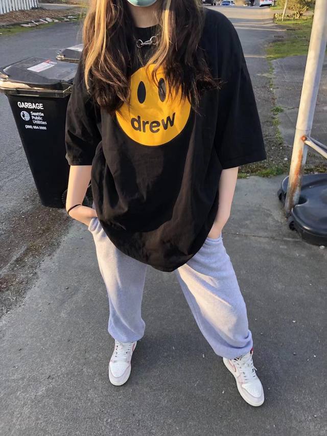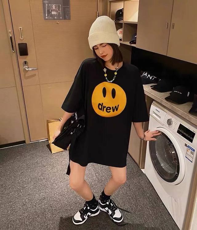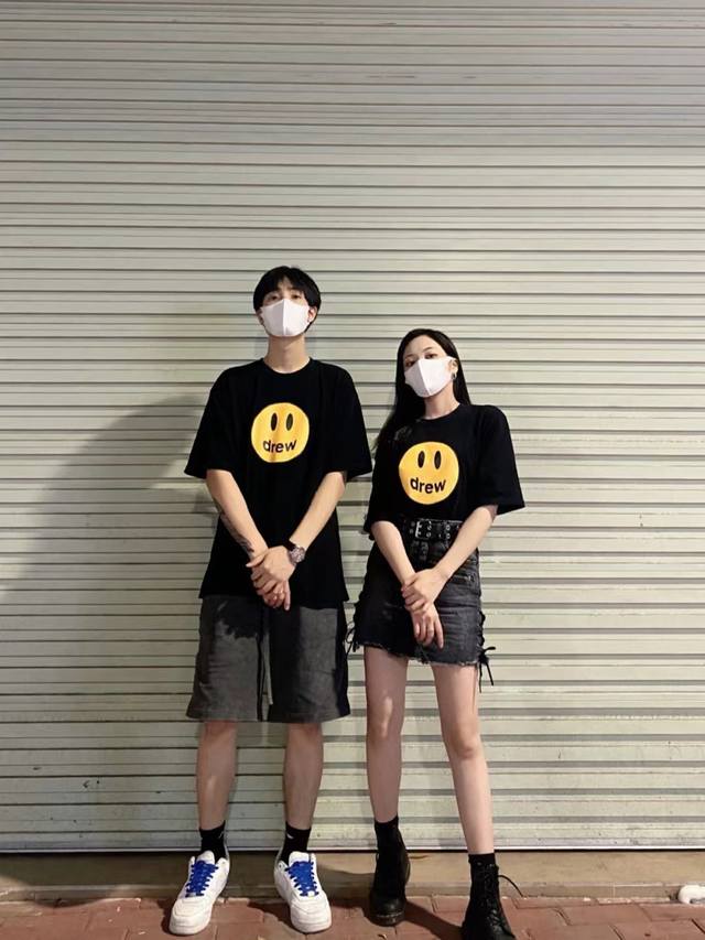 Fabric Upgrade, Style No.: X806 Drew House Classic Smiley Face Short-Sleeve T-Shirt. Made of pure cotton, this short-sleeved T-shirt is soft to the touch and has a smooth, delicate surface. The screen printing is a testament to the fact that the simplest things often reveal the finest details. Imported environmentally friendly inks are used, resulting in a seamless, almost weightless feel, as if the print is perfectly integrated into the fabric. A complete set of custom-made accessories, including hangtags, washing instructions, main label, and even small details like safety pins, are provided. Sizes: S, M, L, XL. Available in black and white.