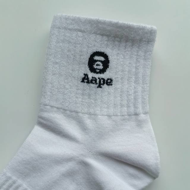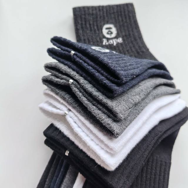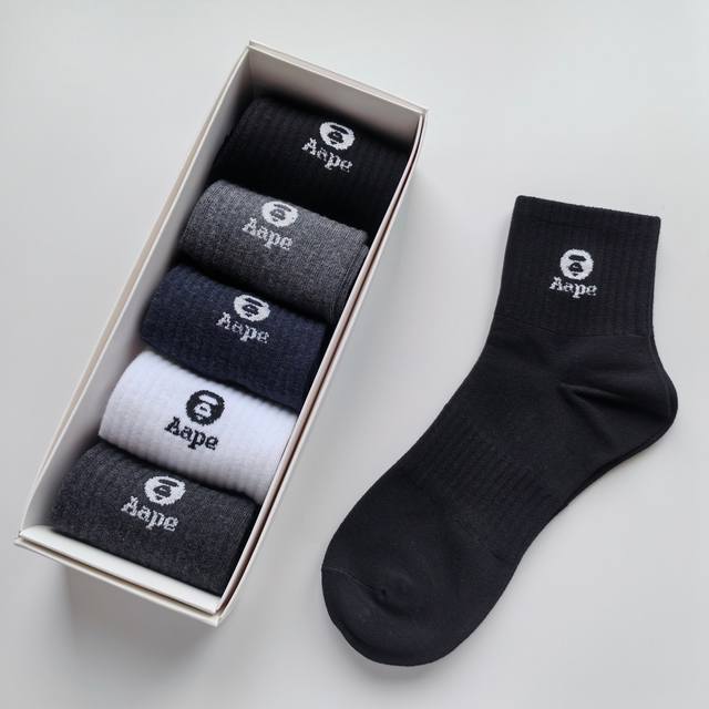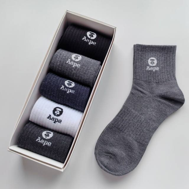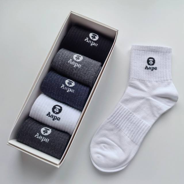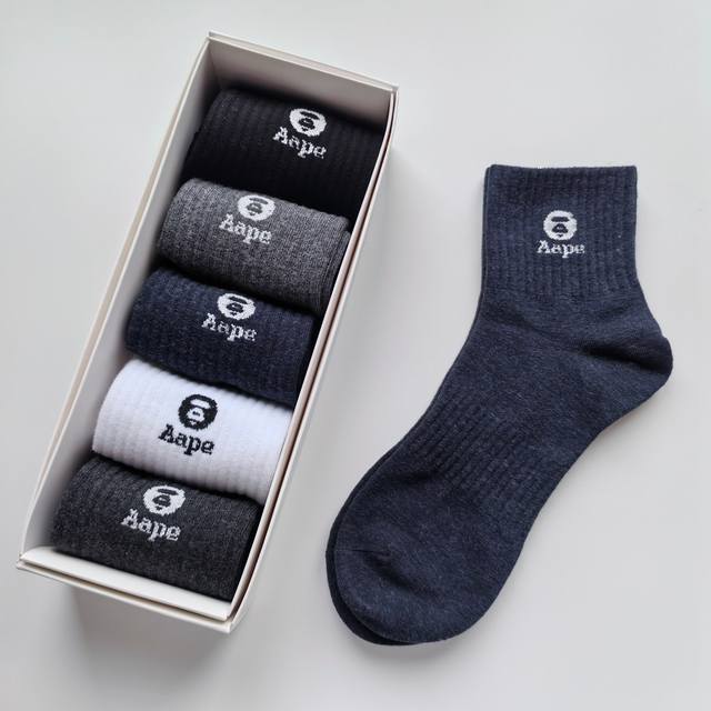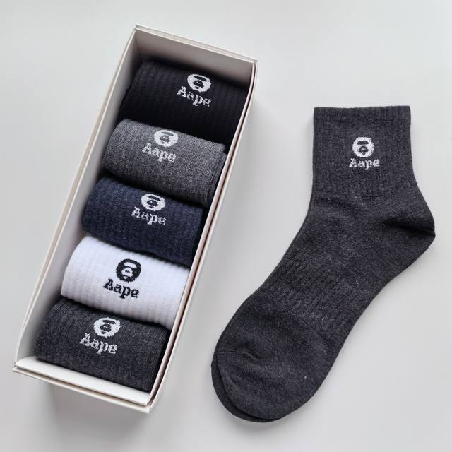 / Five pairs per box, high-quality Aape black, white, grey, and navy mid-calf sock
