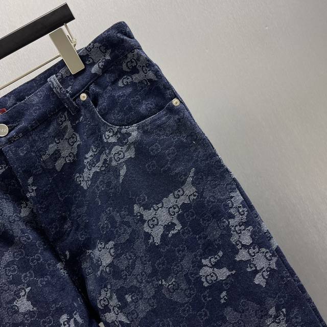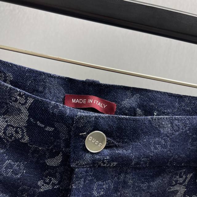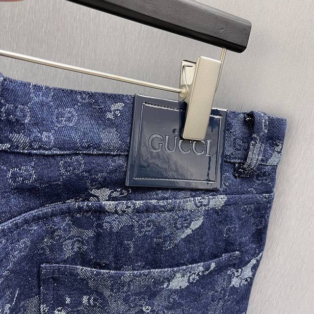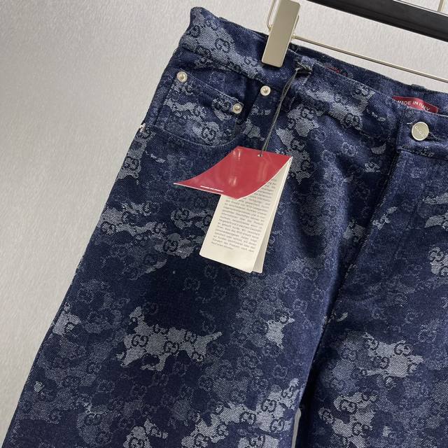 Gg Jacquard Denim Pants Ddd Size: S-XL Ddd The 2025 Early Autumn collection blends denim pieces with exquisite details, elevating everyday looks. These shorts are crafted from a deep blue and ivory marble-effect denim jacquard fabric Ddd Gg, adorned with a Naplak leather Ddd tag, exuding a unique charm. DDD