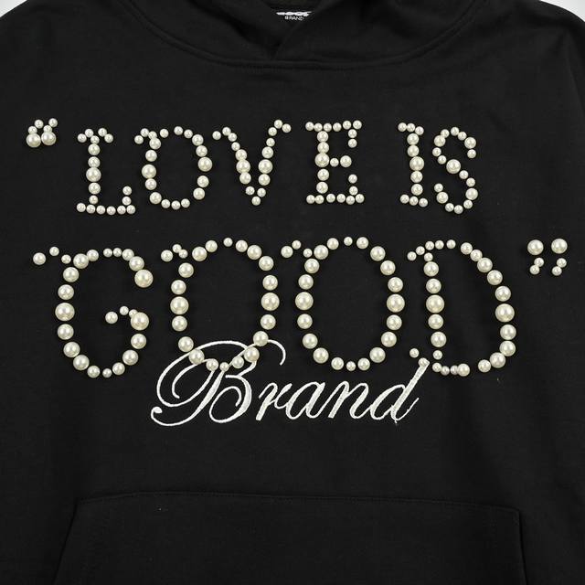Good Brand, Love Is Good Pearl Hooded Sweatshirt, unisex, 500g pure cotton fabric, 1:1 replica. Colors: Black, Blue. Sizes: S, M, L, XL.