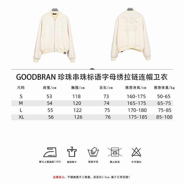 Goodbran Pearl Beaded Slogan Letter Embroidery Zipper Hooded Sweatshirt. Made of 500g terry cloth, 100% pure cotton, it will never deform after washing. Unisex style, details identical to the official website, complete packaging, all three labels included, moisture-proof paper. Distinguish from market counterfeit products at will. Os fit, fits up to 240 lbs, comfortable and stylish. Colors: Black, Beige. Sizes: S-XL.