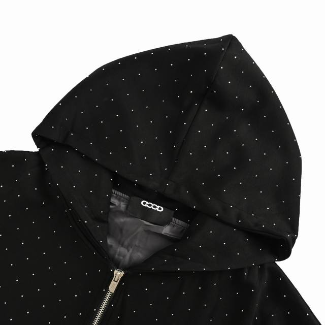 Goodbrand 25Fw Sparkling Silver Starry Sky Rhinestone Zipper Hooded Sweatshirt (Unisex) - Consistent with official website details, complete packaging, all three labels included, moisture-proof paper. Distinguish from market counterfeit products. Fabric is made of 420g composite material with an outer layer of ultra-soft polyester fiber and an inner layer of delicate and soft texture. Stylish and smooth appearance. Colors: Black/Grey. Size: S-XL.
