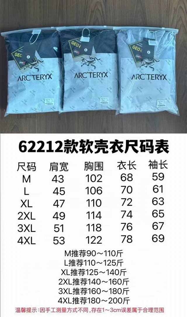 High quality, exquisitely packaged in Sydney paper. Arc'teryx 25th Anniversary New Outdoor Couple Style Windproof Waterproof Hooded Softshell Jacket! The fabric has excellent breathability, allowing body heat and moisture to escape quickly, keeping you dry. While not a dedicated thermal jacket, the inner lining is made of thin fleece, providing some warmth in spring and autumn. In winter, layering with fleece or other mid-layers can also meet warmth needs in certain temperatures. The looser, regular fit is suitable for layering. The three-dimensional cut design focuses on conforming to the natural bend of the arms, providing unrestricted comfort and high freedom of movement whether standing, sitting, or lying down. Colors: Black, Light Gray, Navy Blue. Sizes: M-4XL. See size chart in Figure 9.