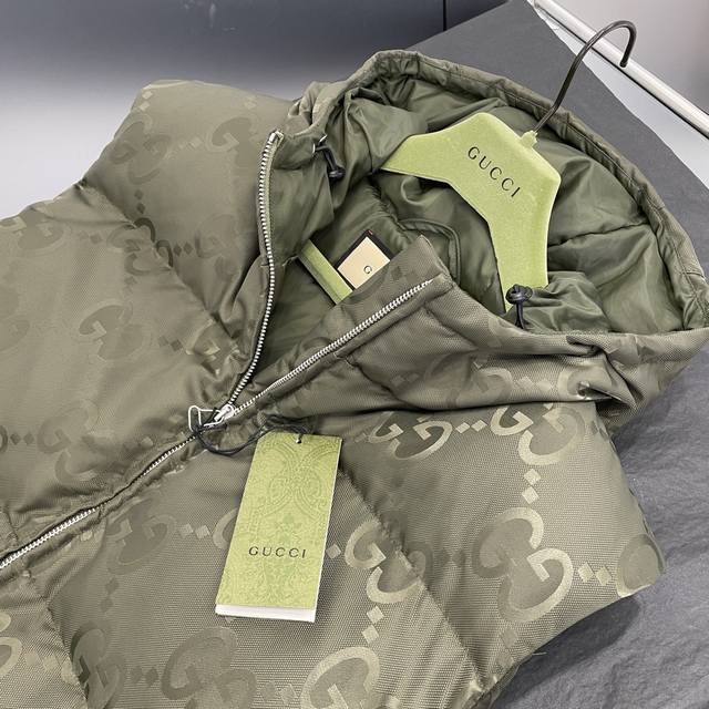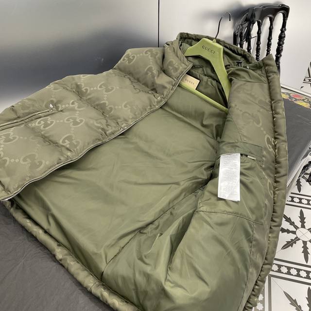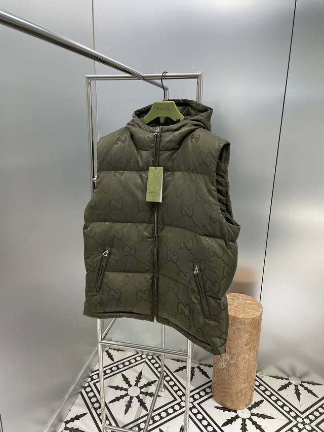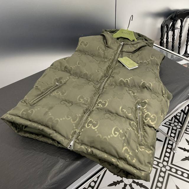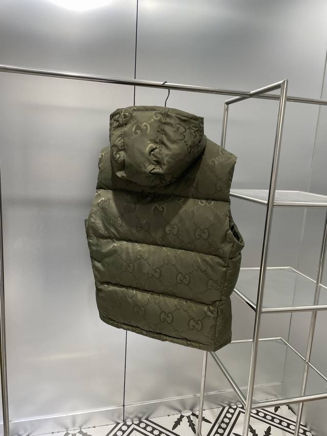 *25 Autumn/Winter New Arrival Super Double G Canvas Down Vest, black Super Double G nylon canvas filled with 90% down (national standard). This Super Double G pattern presents the classic interwoven double G letter pattern in an exaggerated way, vividly showcasing down-filled canvas vests and other ready-to-wear and accessory items. Unisex