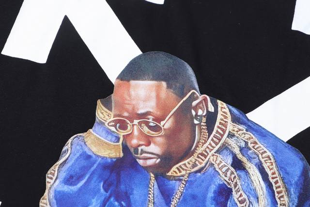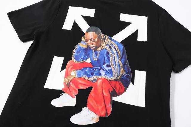 High-version Off-White 26Ss Hip-Hop Themed Printed Short-Sleeve T-Shirt. This Hip-Hop Icon series short-sleeve t-shirt features the brand's iconic arrow logo combined with a hip-hop style character image. The outfit includes a blue top, red pants, and a gold chain. It's a limited edition in this series that pays homage to street culture. High-definition digital printing using imported German machines and environmentally friendly materials ensures pure colors, clear images, and high-temperature heat transfer for enhanced print quality. All accessories are custom-made. Strict quality control. Sizes: S-XL