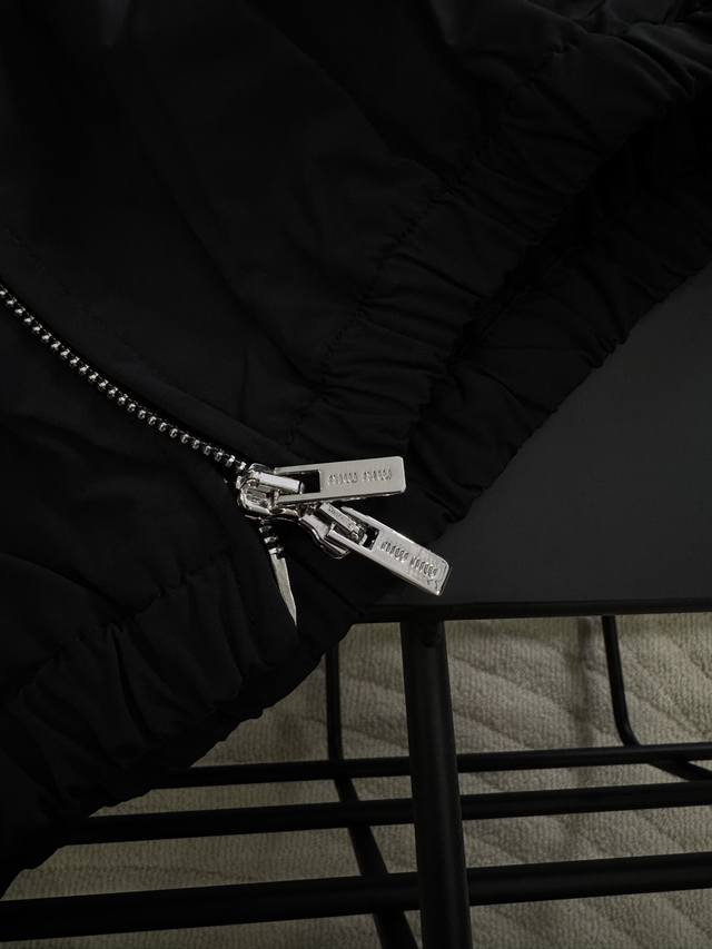 Custom-made brand logo hardware zipper, double zipper pull design, woven logo patch on chest.