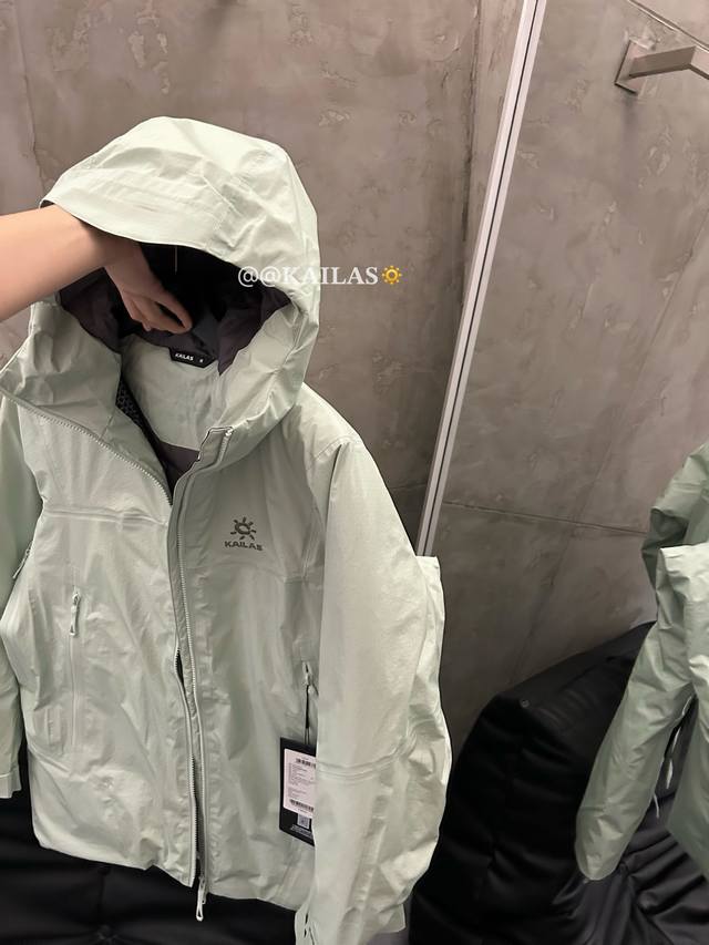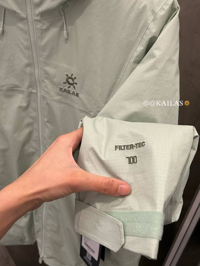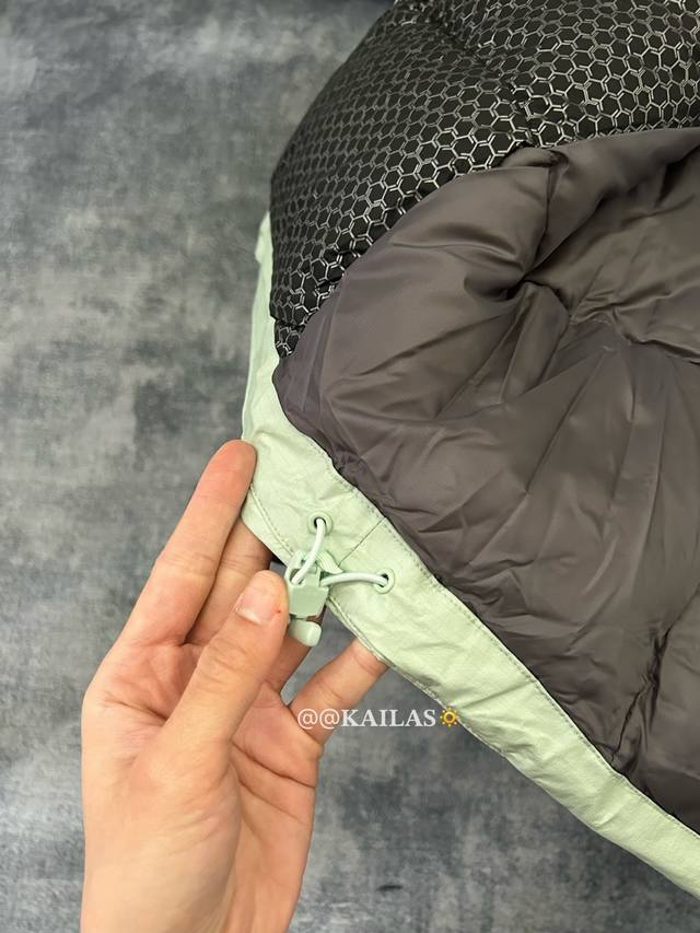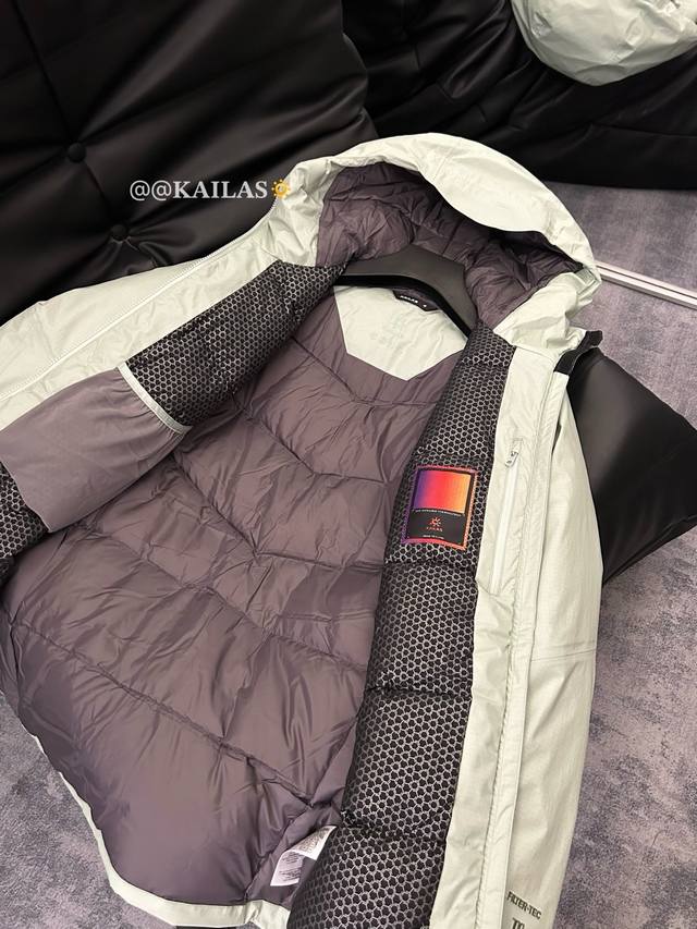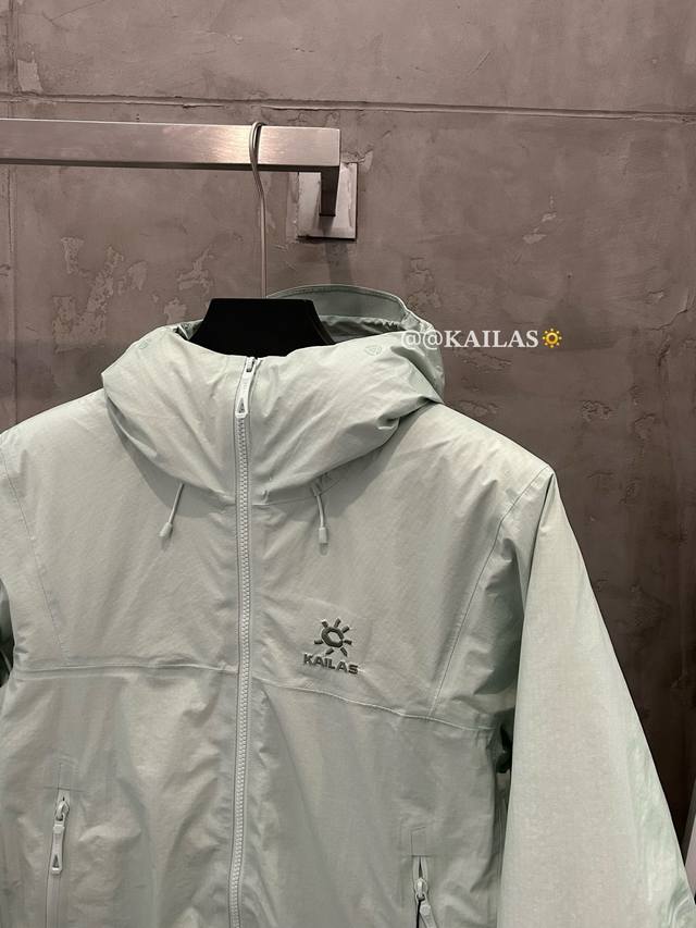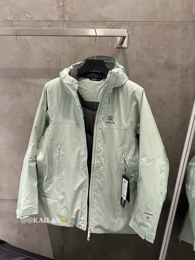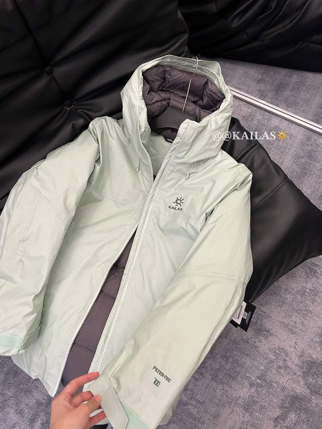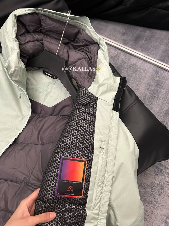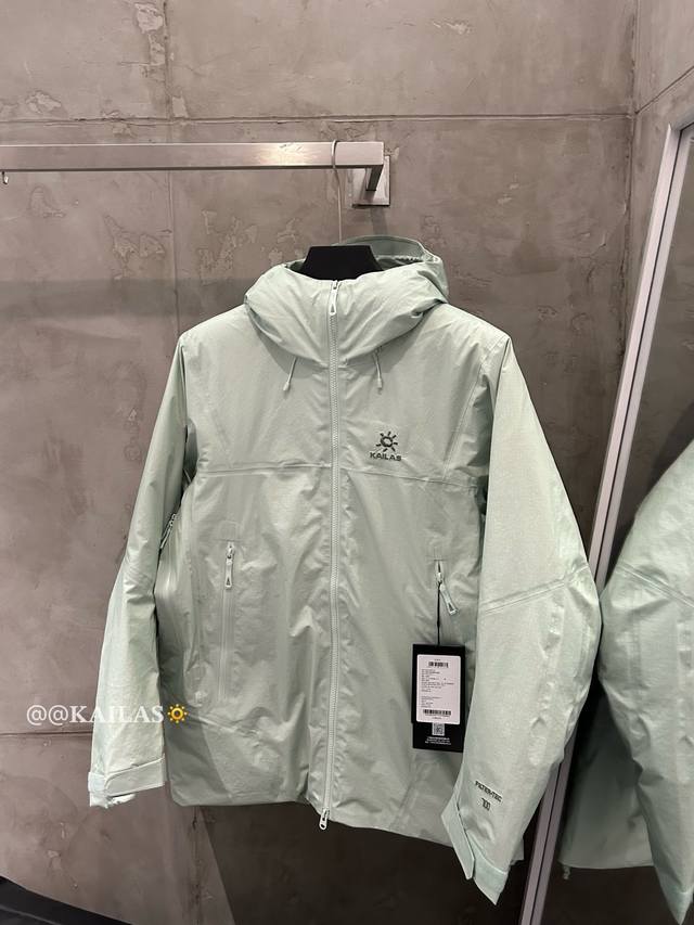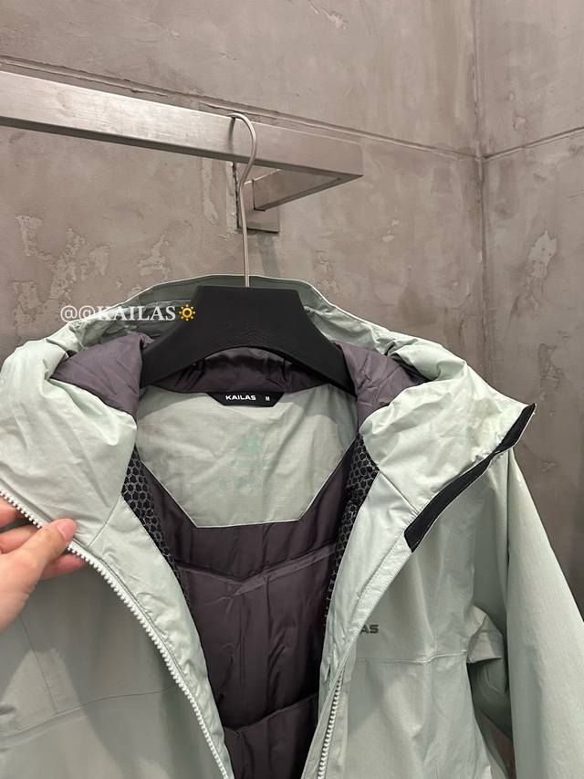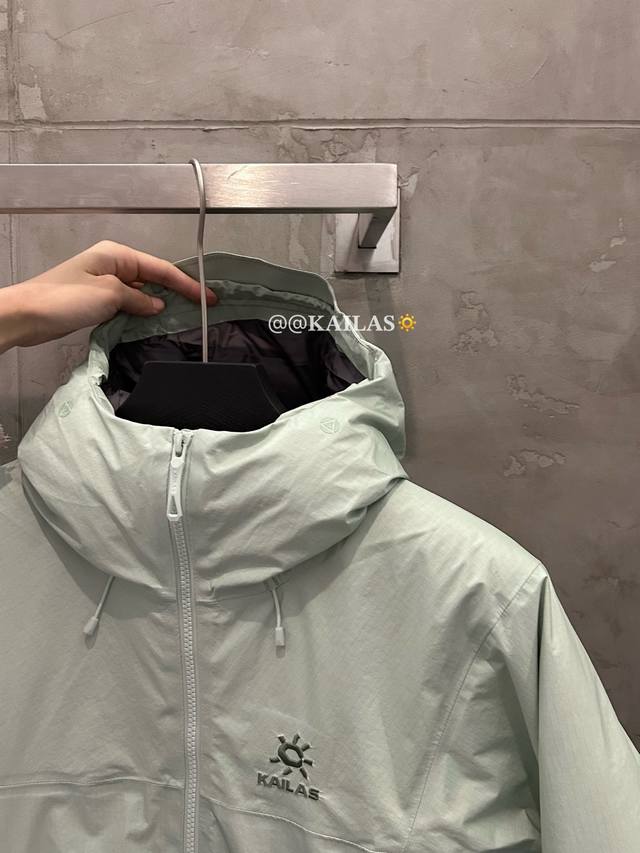 Kailas Aspen Goose Down Jacket in Ice Lake Green (details). DDD