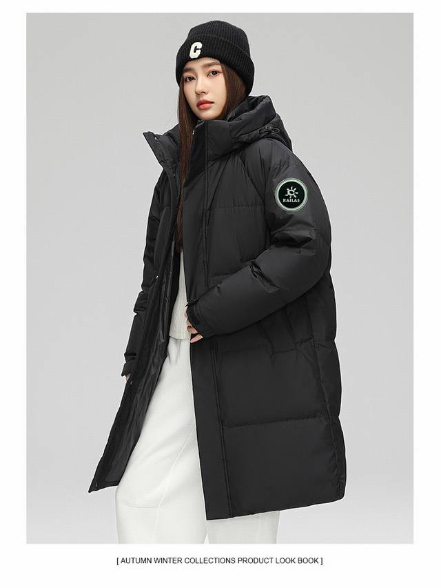 Kailas hooded mid-length down jacket, infused with 90% high-quality goose down in a minimalist silhouette. Lightweight and not bulky, windproof and breathable. The unisex design makes sharing wardrobes possible. On winter streets, it showcases understated yet superior performance, embodying the ultimate armor for everyday wear. Whether navigating city or nature, one piece is all you need. Sizes: S-3XL