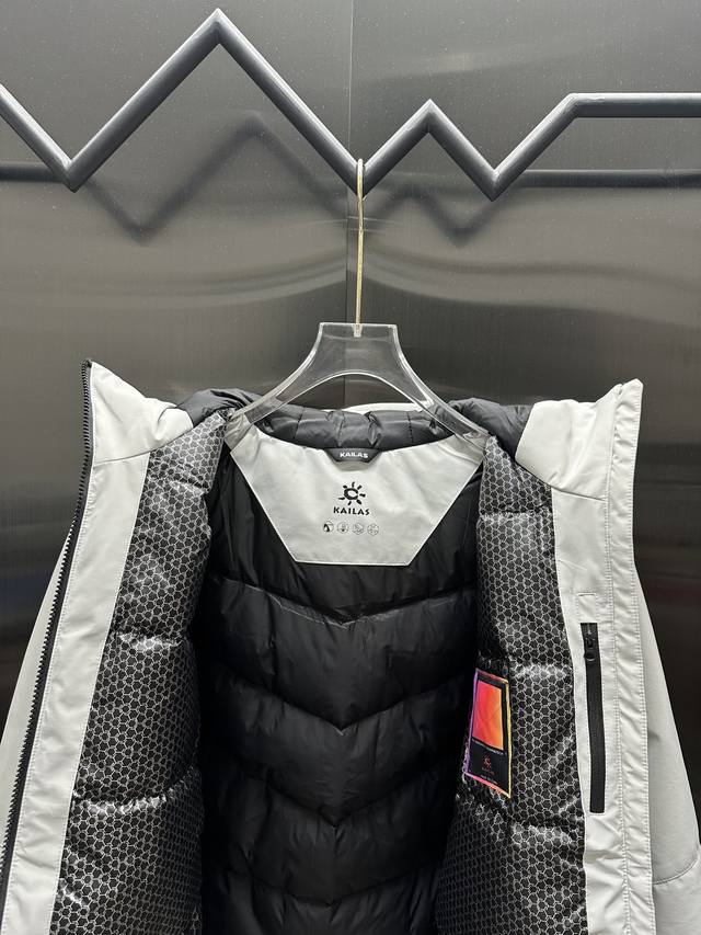 Kailas Montana Outdoor Ski Down Jacket, Ddd Exclusive Source Design Concept: A Chinese hard-shell jacket, this garment is inspired by Aspensnowmass, Colorado, a high-end luxury ski resort in North America favored by professional skiers, celebrities, and Hollywood stars. Hence the name "Aspens Hard-Shell Down Jacket." Each color possesses its own power, blooming with amazing vitality and beauty on international ski slopes as day and night change. This down jacket offers all-weather protection with hard-shell-level protection, providing excellent warmth in cold and changeable weather, attracting ski enthusiasts to explore and encounter that unforgettable color. Ddd's unique design features the graphene heat-reflective Coreheat function. This function locks in heat in the core area, further enhancing the down jacket's warmth, keeping the wearer warm even in cold environments. Ddd features a curved brim to shield from wind and snow, an adjustable 3D hood that conforms to the head for windproof and warmth, and an adjustable hem. The chest is embroidered with precision using top-of-the-line Japanese Tajima embroidery machines. It also features adjustable temperature control, breathable underarm zippers, and a two-way opening for efficient heat dissipation. It's easy to access items, compatible with backpacks, and allows for hand warming in cold environments. Upgraded adjustable sleeve tabs provide a better fit and enhanced protection, with increased Velcro coverage for easier one-handed operation. Its ergonomic design enhances athletic performance. The hem is adjustable with one hand to prevent backflow of wind, and the drawstring allows for easy one-handed adjustment. A professional underarm ventilation zipper system with two-way opening provides rapid ventilation and heat dissipation, quickly restoring dryness and comfort without the need for repeated packing and jacket removal. The 360