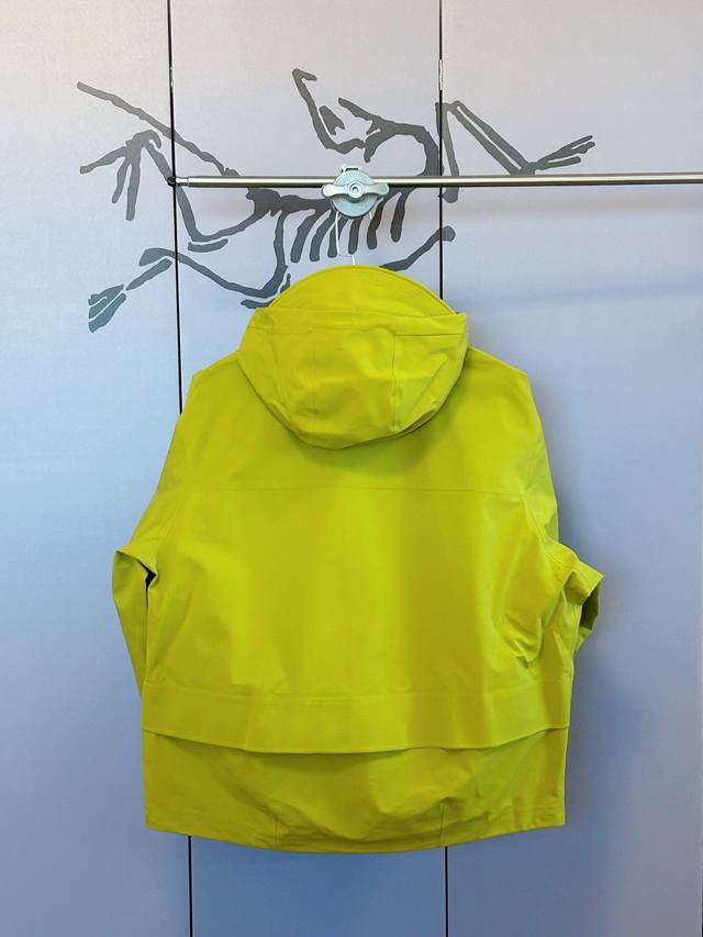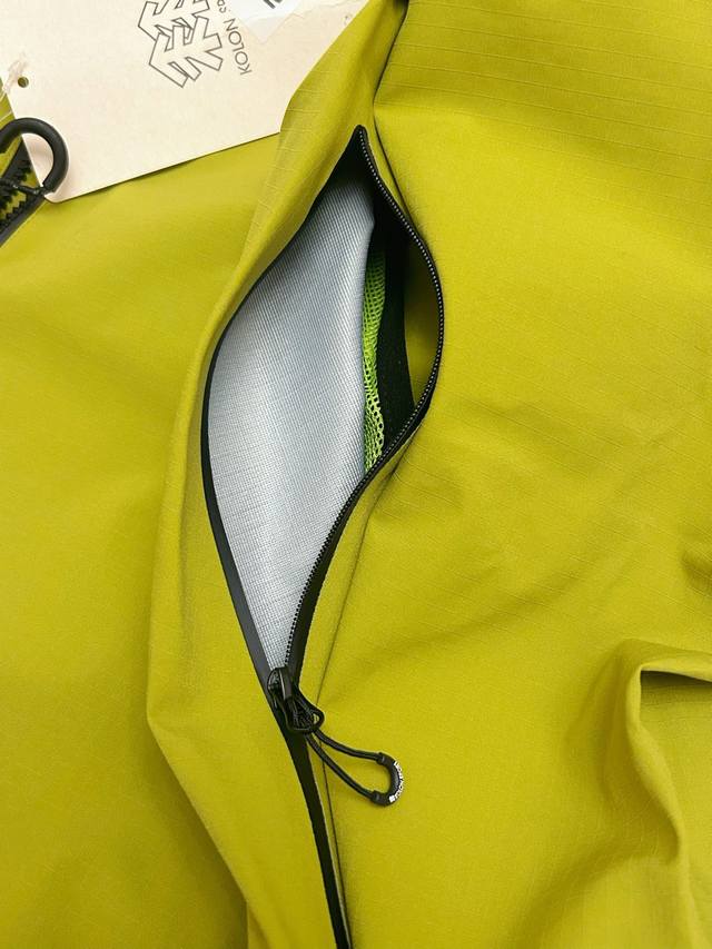 features an adjustable drawstring hood, a drop hood compatible with warm helmets, and a curved brim for better wind and rain protection without obstructing vision. Hand pockets have mesh linings for easy organization