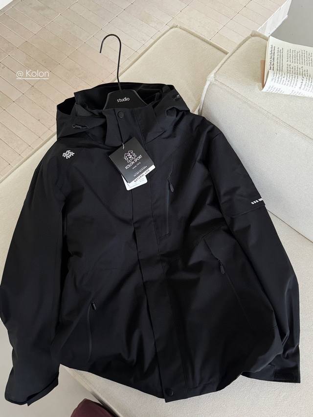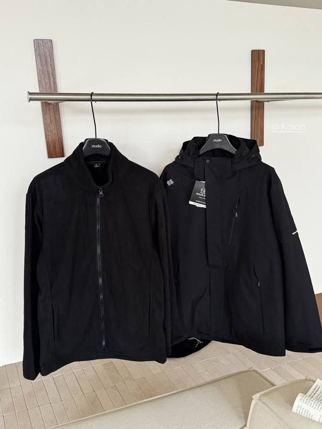 Kolon Waterproof 3-in-1 Jacket. A three-in-one jacket, unisex, extremely cost-effective, and a guaranteed bestseller in 2024! The outer shell and inner lining can be worn alone or together, suitable for various outdoor environments. The outer shell uses 2L waterproof fabric, with a seam-sealed lining for windproof and waterproof protection. It features a detachable hood with a concealed adjustment buckle and adjustment points on the back to tighten and block cold wind. Velcro cuffs and an adjustable drawstring hem prevent wind from entering. The front placket is windproof, and the front chest pocket uses a waterproof zipper with a protective flap at the top to prevent skin pinching. Two slip pockets at the bottom enhance aesthetics and provide storage for essential outdoor gear.