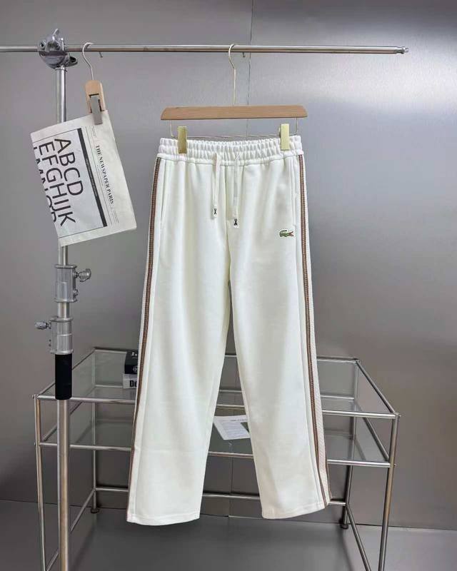 Lacoste French Crocodile Autumn New Men's Sports Casual Drawstring Colorful Webbing Sweatpants Versatile Solid Color Straight Leg Loose Long Pants Couple Style Limited Edition! Comfortable and Luxurious! British high-end luxury, these silky cotton heavy-duty terry straight-leg trousers feature a minimalist, understated style. The clean, simple cut offers comfort and style, effortlessly creating a sophisticated look. The fabric is a carefully selected cotton blend stretch terry knit, lightweight and airy, its softness and richness against the skin are immediately apparent. Its unique weave structure creates a layer of still terry loops, providing excellent warmth and breathability. The air-layer fabric's advantages extend beyond warmth and breathability; its excellent feel and drape make the trousers even smoother and more flowing. The soft touch feels like a second skin. It boasts excellent moisture absorption, quick-drying properties, and breathability. The high-density twisted fabric offers good wrinkle recovery and resistance. The classic straight-leg cut, with its three-dimensional center pleats at the front and back, flatters the leg shape and elongates the legs. Side webbing accents create a slimming and height-enhancing effect. The sophisticated and simple design is distinctive and outstanding, suitable for both business and casual occasions. Colors: Off-white, Black. Sizes: S-4XL