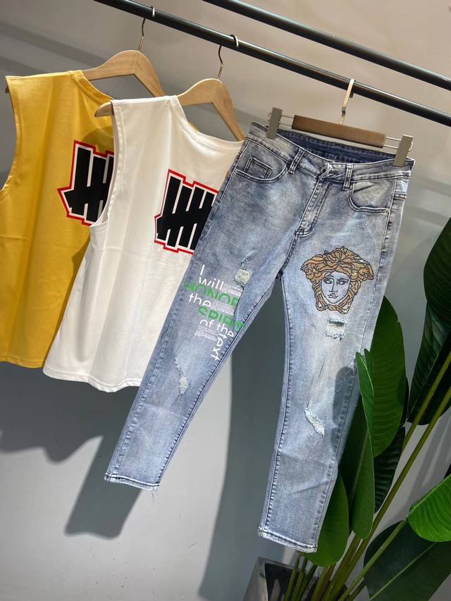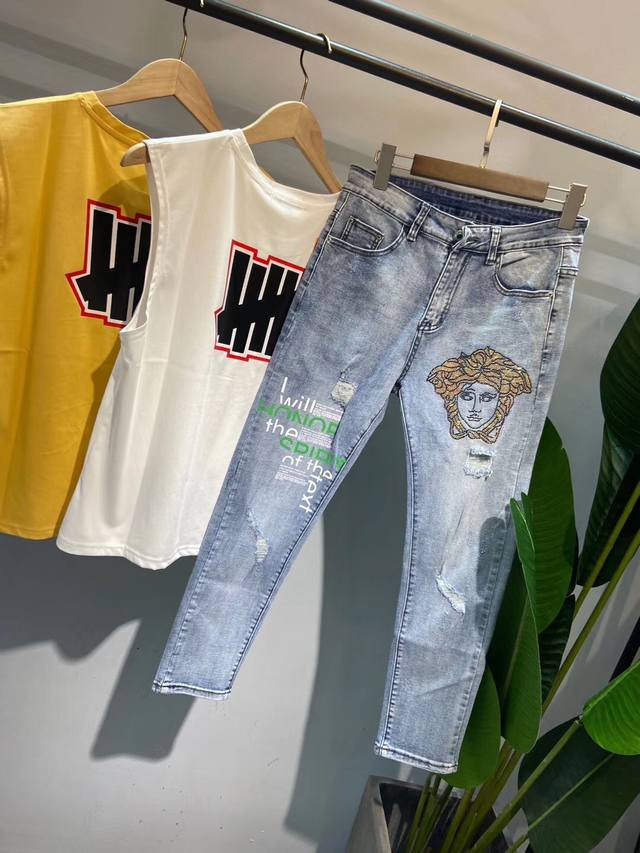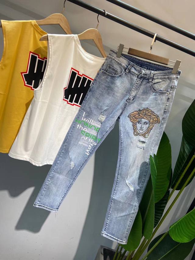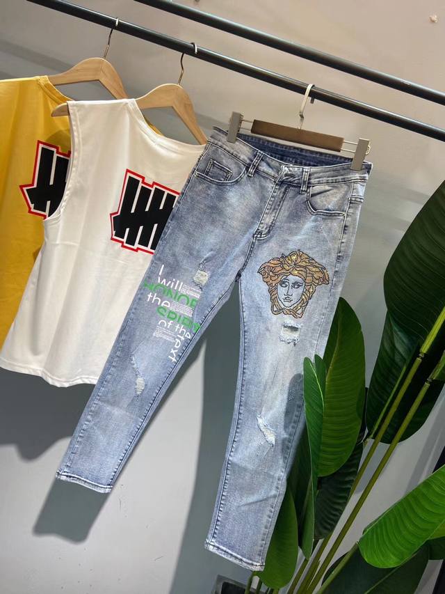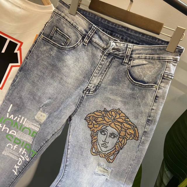 Latest trendy jeans, available simultaneously at official stores and online retailers. Features include heavy-duty craftsmanship, hot-stamped rhinestones, letter badges, custom denim wash, and all fabric and accessories are 1:1 molded and custom-made with original factory hardware. High-quality 3D tailoring! Sizes: 28-34 DDD