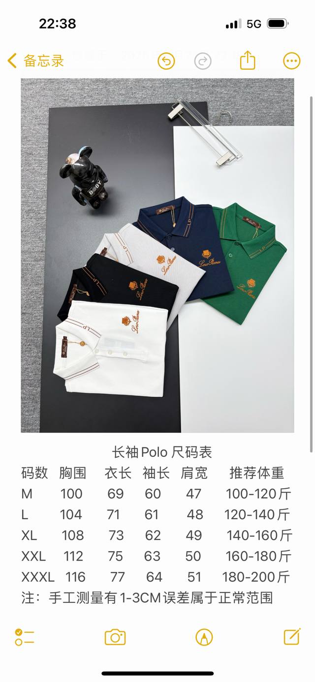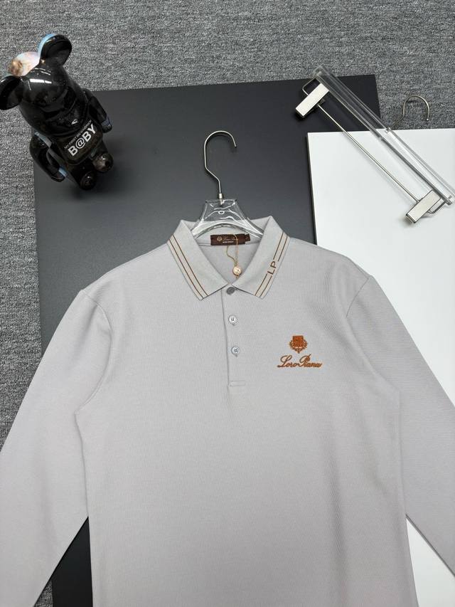 Loro Piana New Embroidered Long-Sleeve Polo Shirt. Made with 250g pure cotton pique fabric, custom-dyed in the same vat, it feels incredibly comfortable and smooth. The cut is crisp and stylish. Produced by a top-tier brand's OEM factory, featuring imported Behringer embroidery machine for rich and textured embroidery. The ribbed cuffs and collar are made with imported yarn, ensuring long-lasting shape retention. A fashionable and unique autumn/winter style, super versatile and attractive. Suitable for both men and women, a must-have. Colors: Black, White, Royal Blue, Gray, Green. Sizes: M-3XL.
