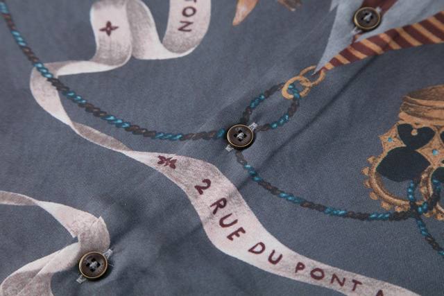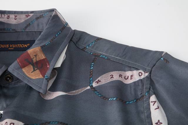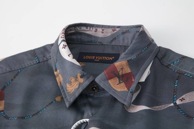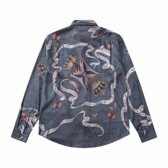 Lou 25Fw New Crown Mulberry Silk Shirt. Made with high-count mulberry silk Tencel, the fabric feels as smooth and soft as clouds, lightweight and unrestricted against the skin, exuding a high-end feel. The shirt is adorned with classic retro patterns and letter prints. Custom-made shell buttons are achieved using digital direct-to-garment printing. The edges are meticulously finished, and the stitching is neat and delicate. The curved hem perfectly accentuates the waistline. Sizes: S, M, L, XL. In stock, ships immediately.