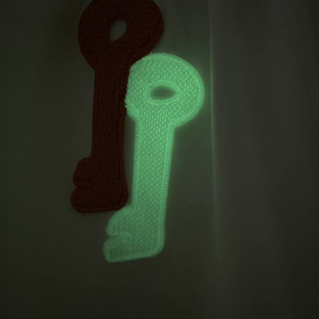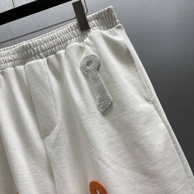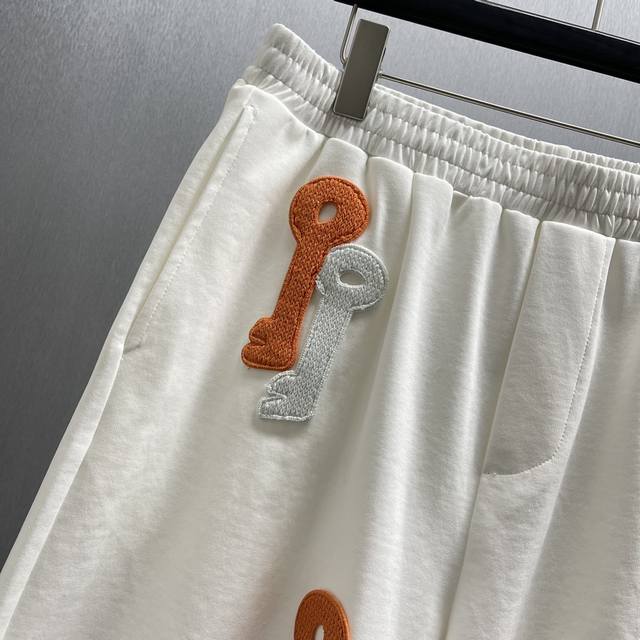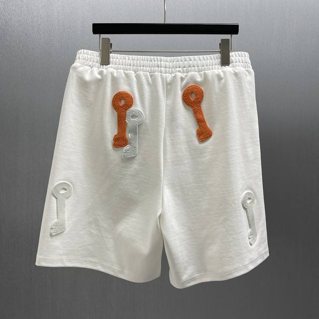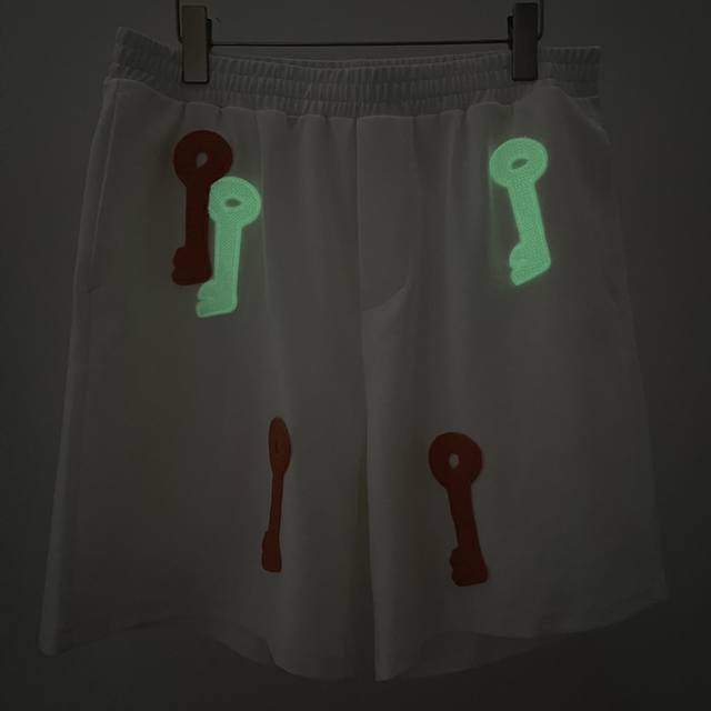 These shorts combine fashion and fun, featuring a classic white base for a simple and stylish look. They are embroidered with key patterns in different colors, appearing orange and white in normal light, while some key patterns glow in the dark. They can be paired with a matching short-sleeved shirt