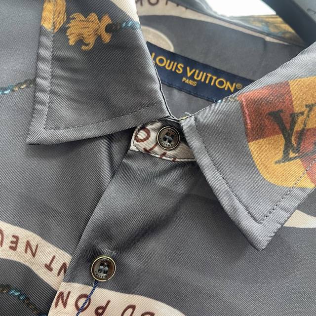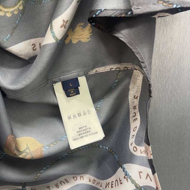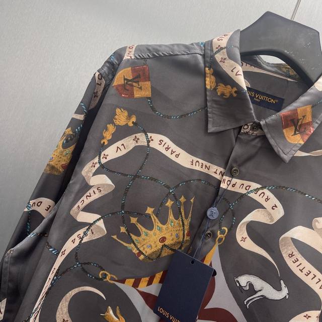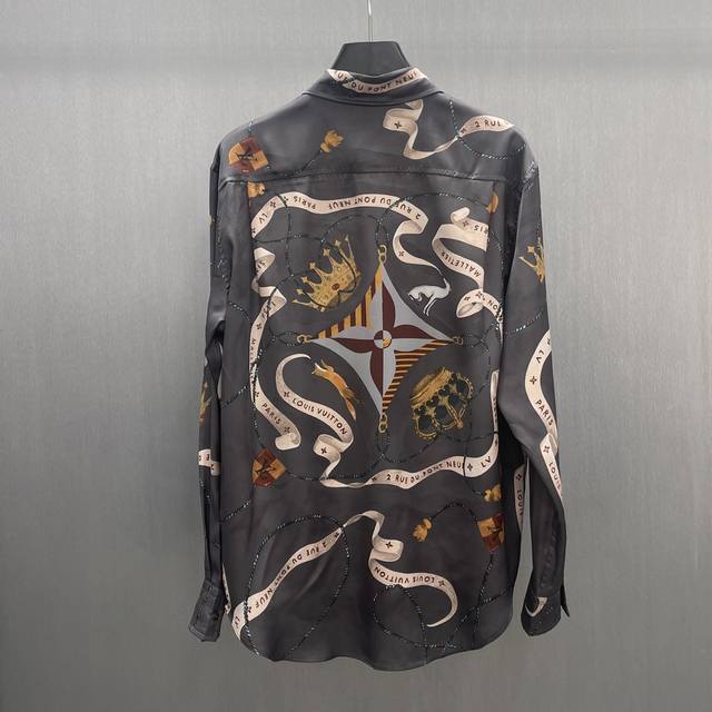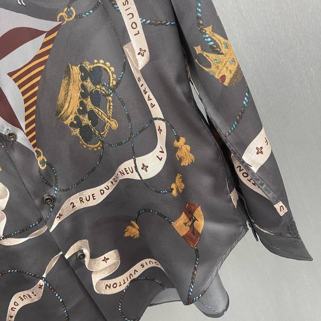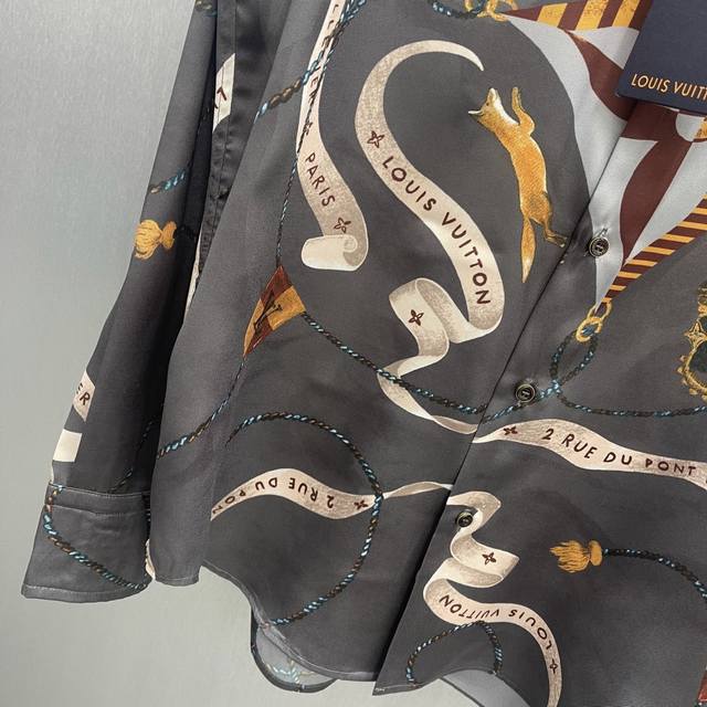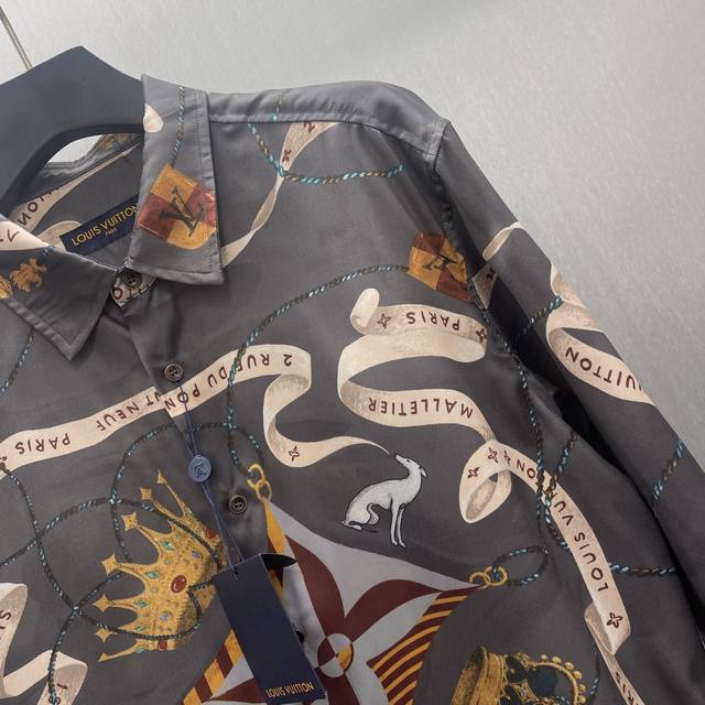 Lu Fox Ribbon Crown Shirt Ddd Size: S-XL Ddd This flowing shirt is made of mulberry silk and features the collection's opulent Heart Emblem pattern. The base print includes ribbons, the brand logo, a crown, Monogram flowers, dogs, and a playful fox. Luxurious and sophisticated, perfect for a festive evening look. DDD