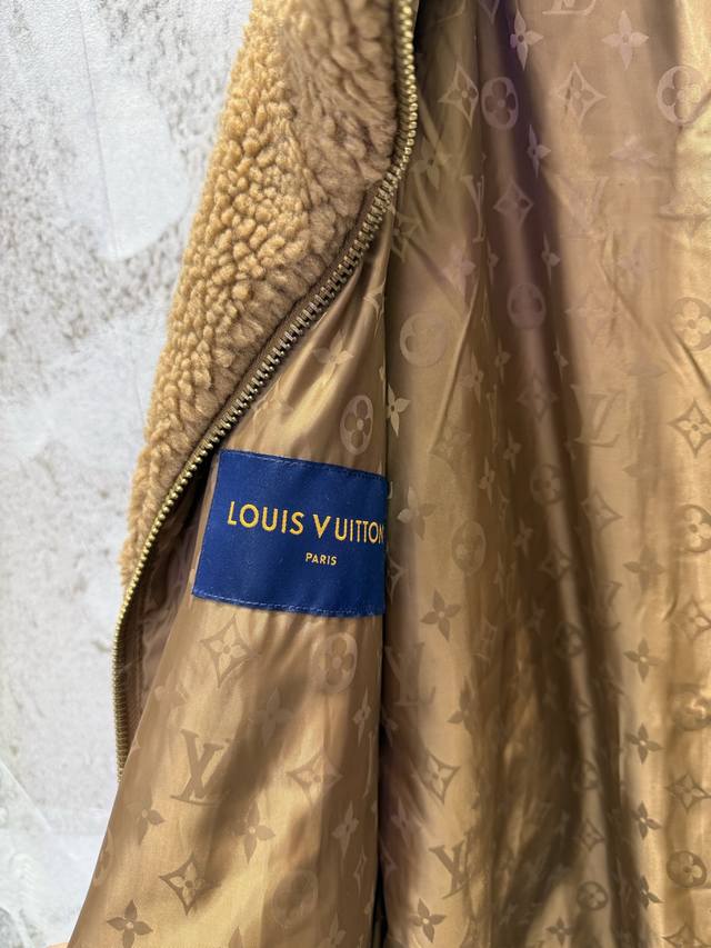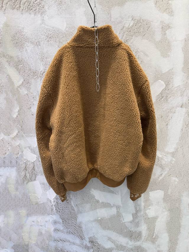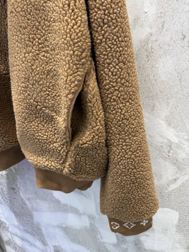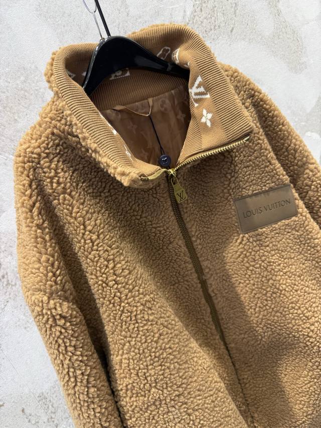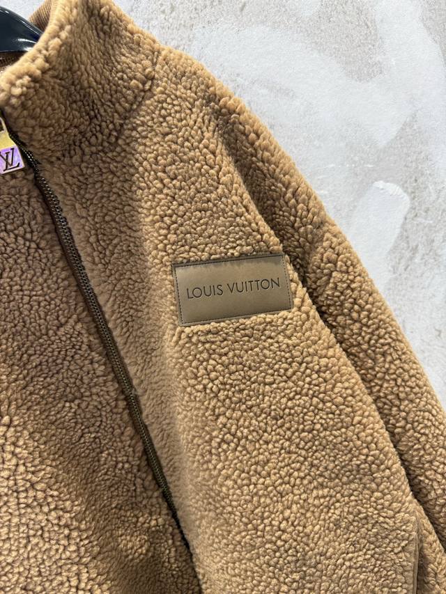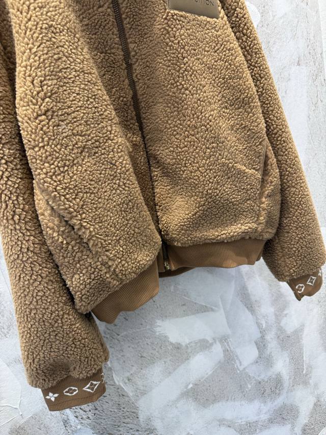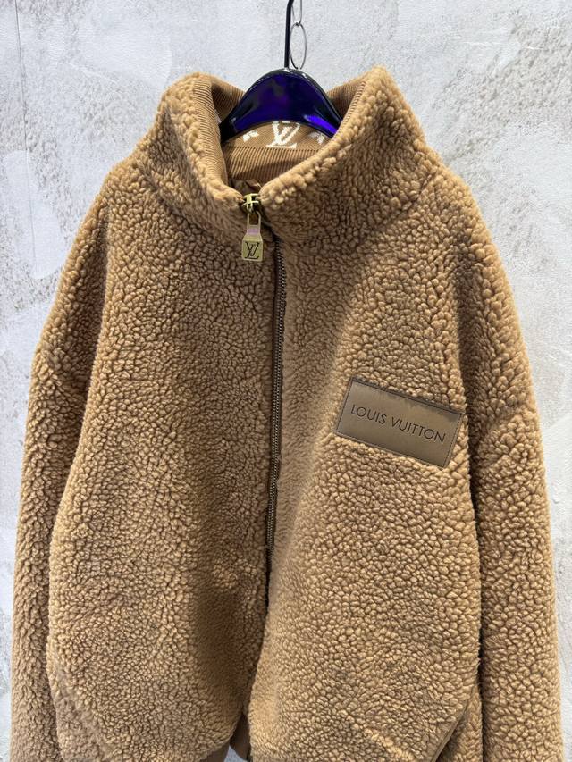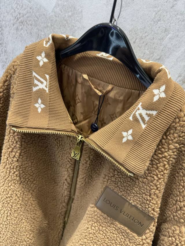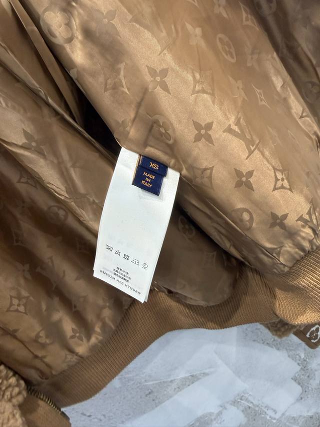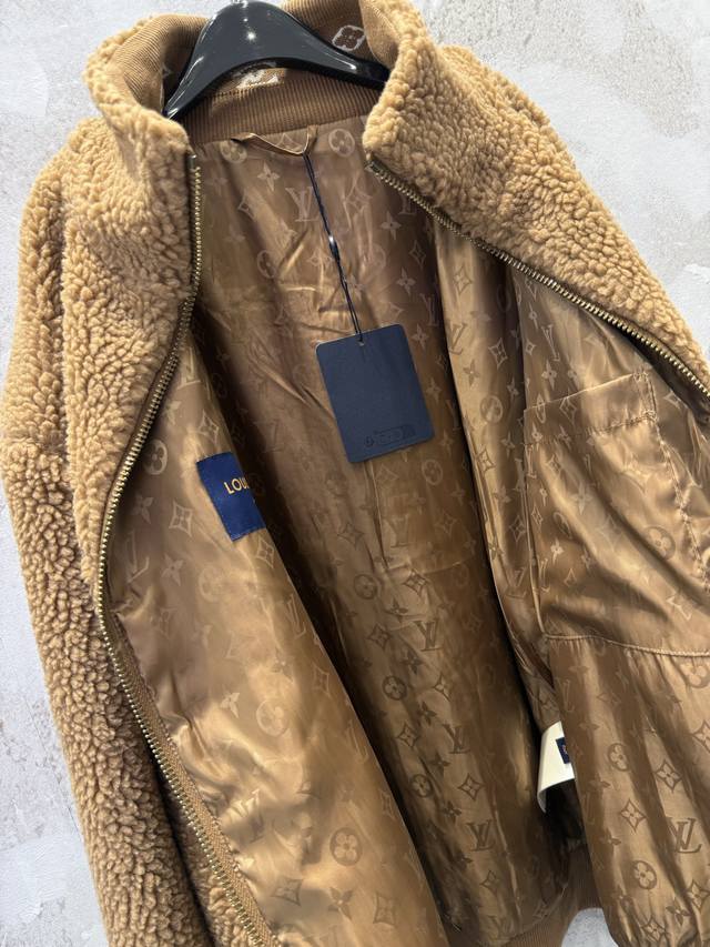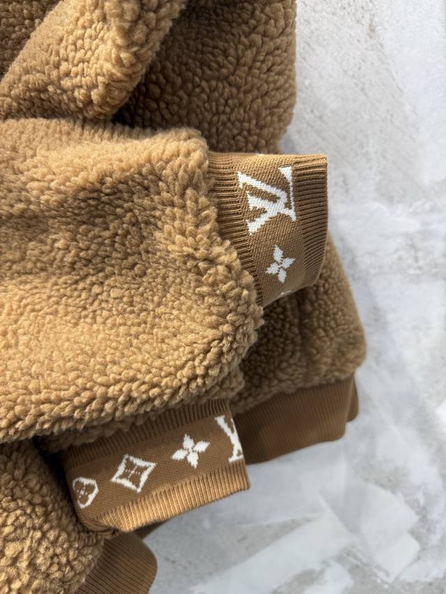 LV Leather Teddy Bear Lambswool Stand Collar Waist-cinching Jacket (Ddd) The fabric is a blend of 53% polyester and 47% acrylic lambswool. The bottom is treated with a dust-removing and pill-resistant coating. The face is sheared to ensure uniform hair length, resulting in a delicate, fluffy, and three-dimensional feel, providing warmth and comfort. It features an embossed calfskin leather patch on the chest, custom-woven jacquard wool ribbing on the cuffs and inner collar, and a full-coverage monogram patterned silk lining. The shoulders and sleeves are machine-sewn first, followed by a flatbed zipper. The placket zipper hardware includes a custom-made, matching size 4 brass zipper with engraved pull tabs. All accessories and labels are included, showcasing quality and attention to detail. (Ddd) Colors: Black, Brown Sizes: Xs, S, M, L (Ddd)
