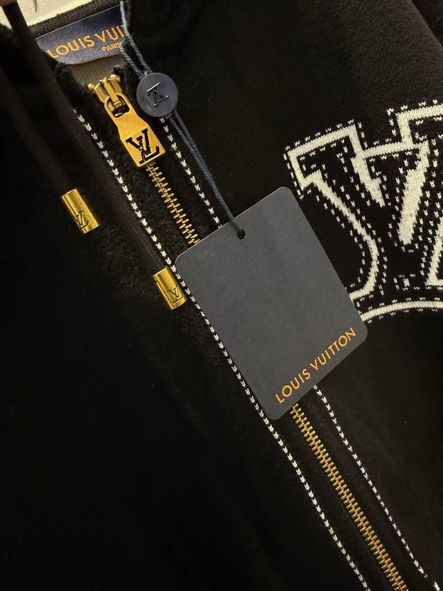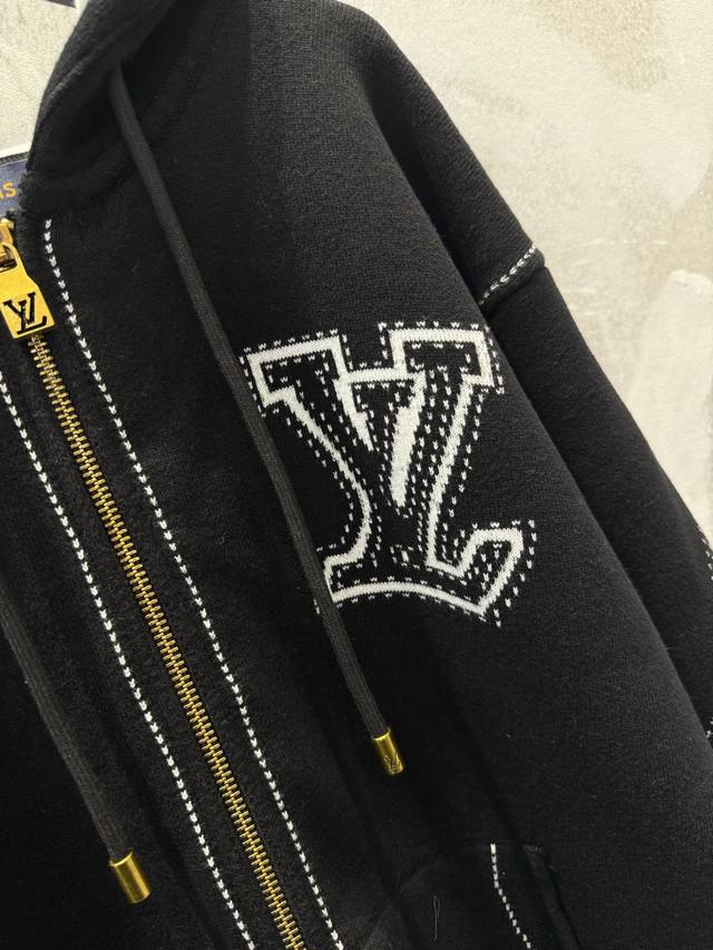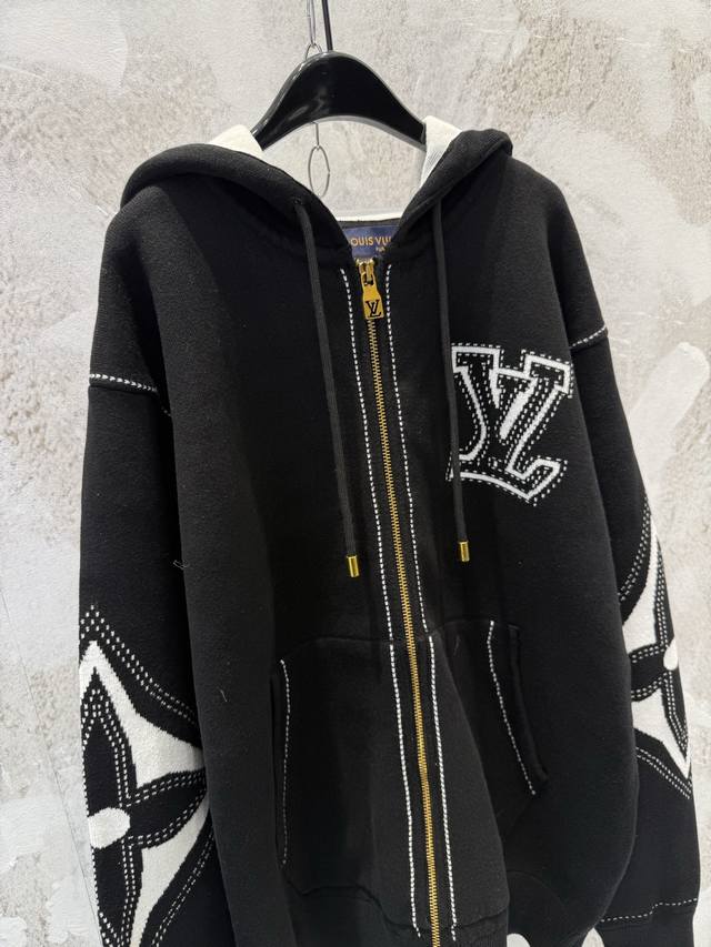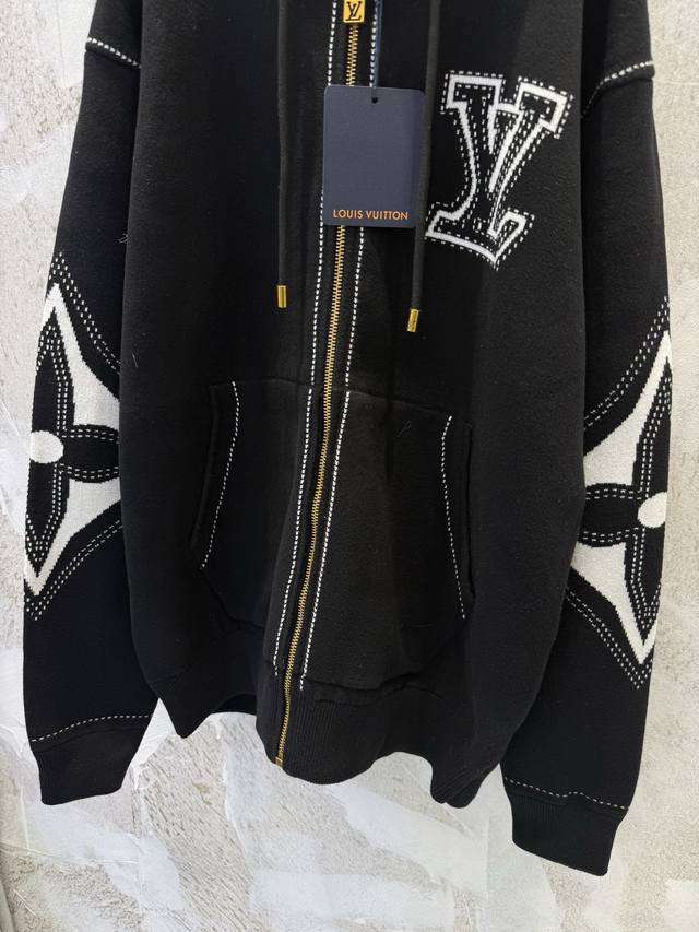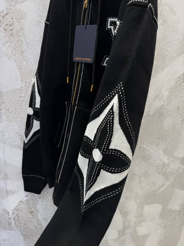 LV Monogram Floral Intarsia Zipper Cotton Hoodie Sweater Cardigan Black Ddd This lightweight cotton zip-up hoodie features an intricate intarsia weave, showcasing letters and large Monogram flowers on the front and elbows, with dotted lines creating a visible stitching and embroidery effect Ddd Sizes: Xs SML DDD