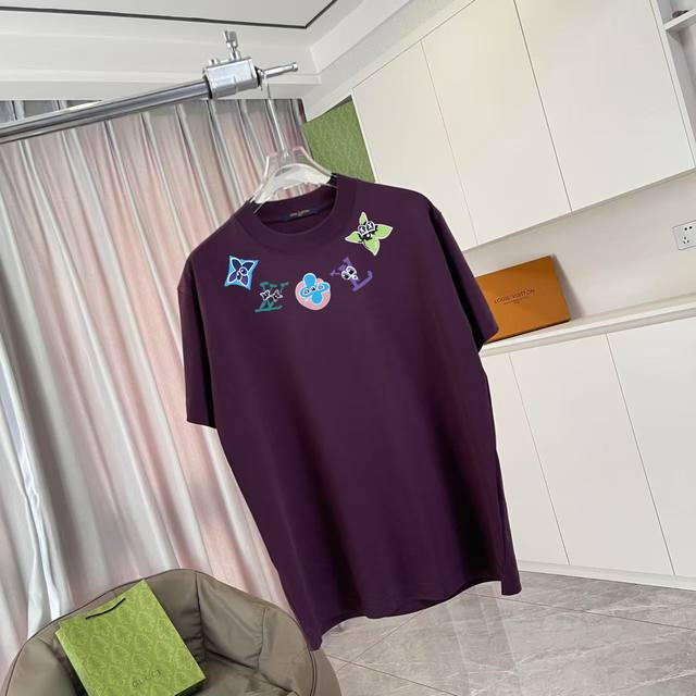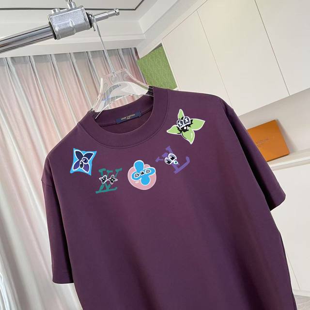 LV*2025 Summer New Style Personalized Letter Logo Print Custom Fabric 300G Short Sleeve T-Shirt Unisex Sizes: SML XL Colors: Black, White, Lake Green, Purple