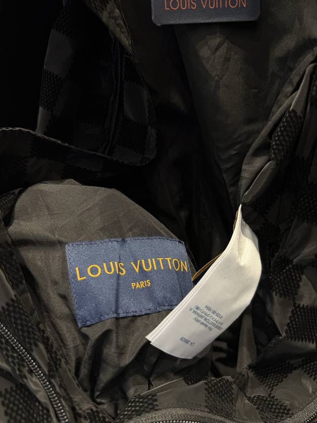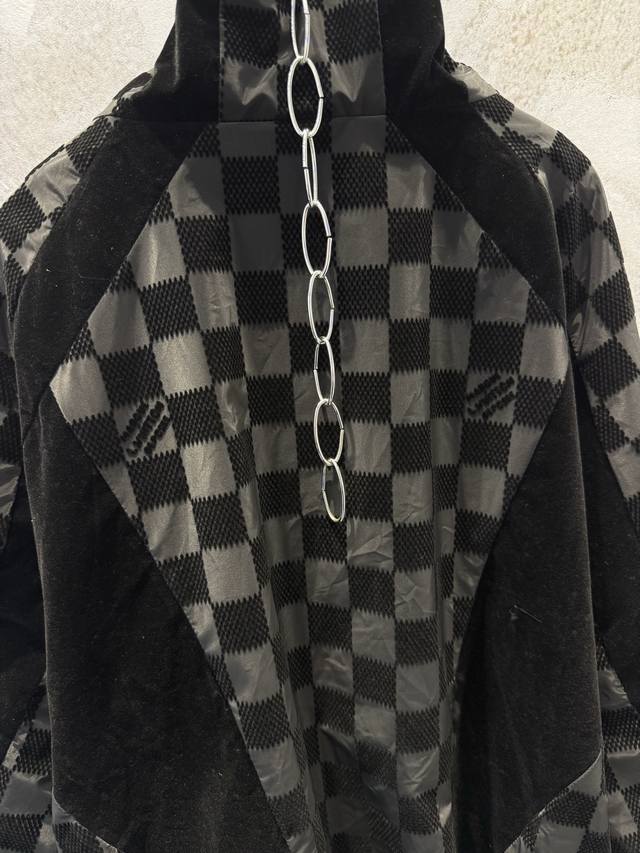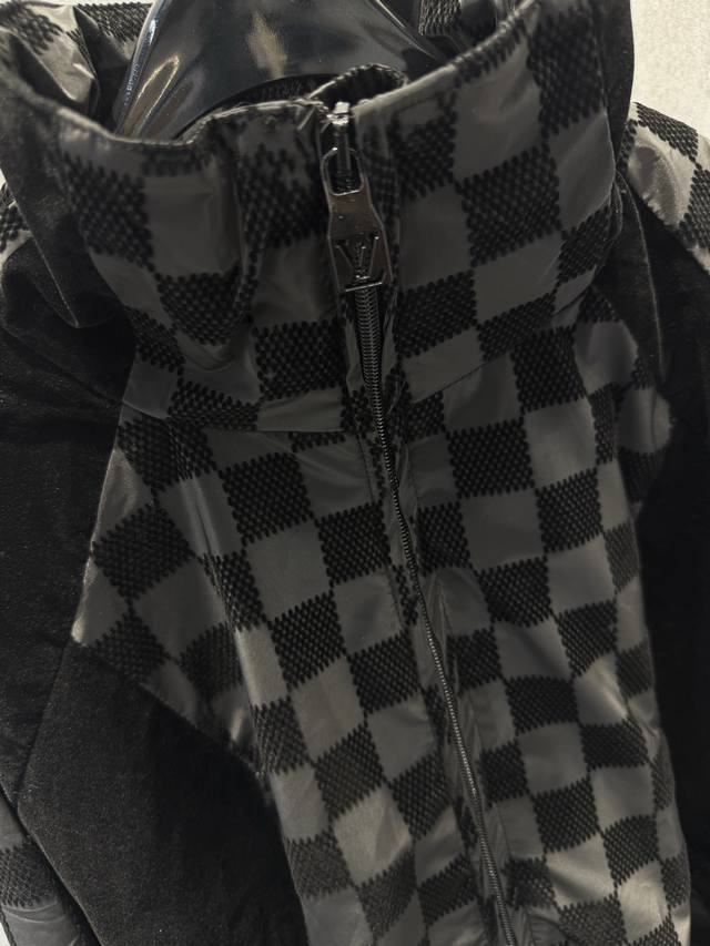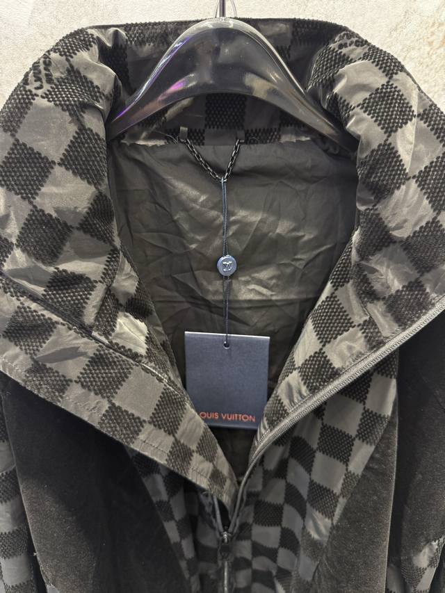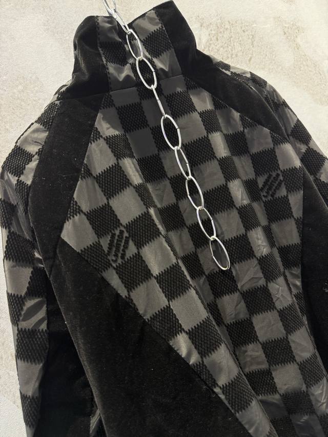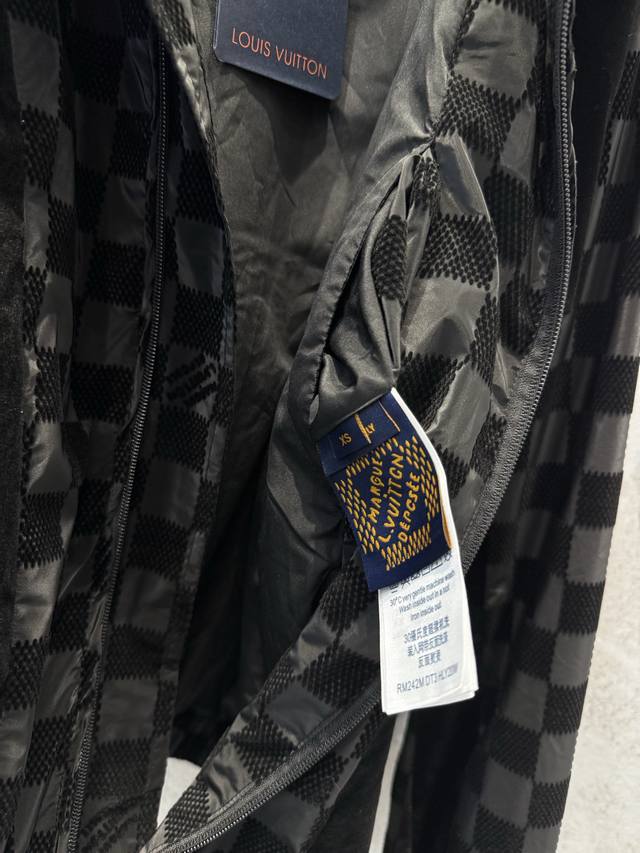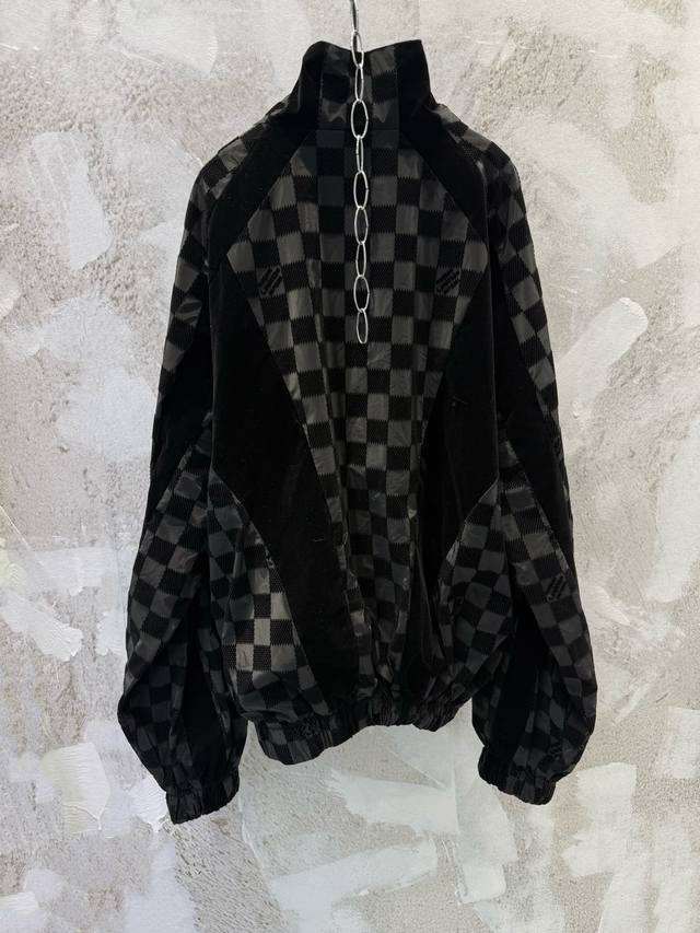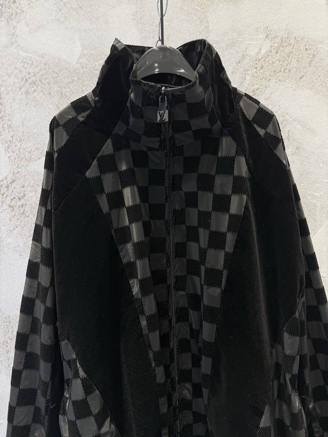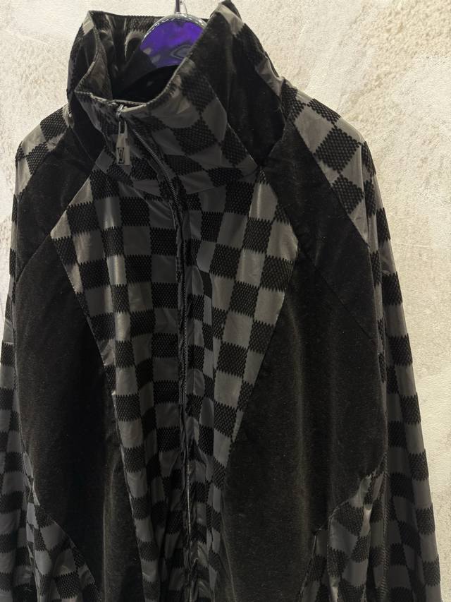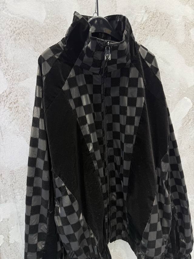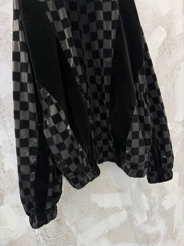 LV25Ss Correct Version Checkerboard Letter Flocked Jacquard Jacket. Original version purchased for 24,600 and developed using 100% nylon fabric. A special jacquard flocking process adds a checkerboard pattern and letter logo to the originally dyed nylon fabric. Positioning and cutting are used to align the checkerboard logo; each size has its own pattern for left-right alignment according to access control. Multiple pieces are stitched together, combining full-flocked technical fabric with jacquard flocked checkerboard fabric, resulting in a high scrap rate. The lining uses viscose fiber with a technical coating to ensure breathability and improve skin comfort. Sizes: Xs, S, M, L.