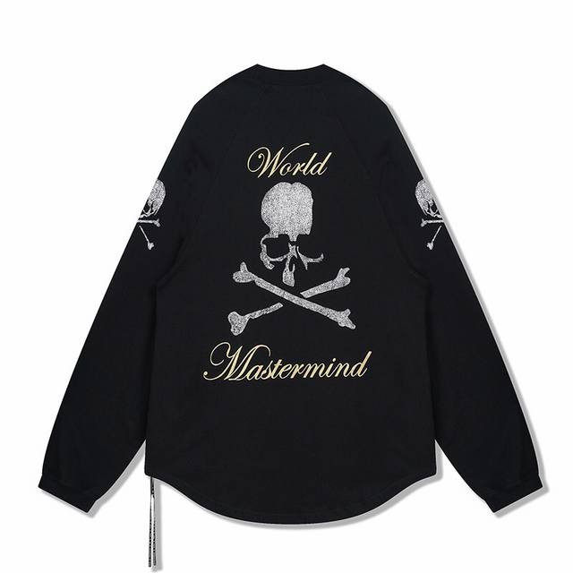 Mastermind Japan Limited Edition Custom-Made Long T-Shirt with Bursting Gold and Silver Glitter Skull Print. Made of 300g custom-made double-yarn pure cotton. Mmj High Street Drop Shoulder Oversized Loose Long Sleeves. Sizes: S, M, L, D, D.