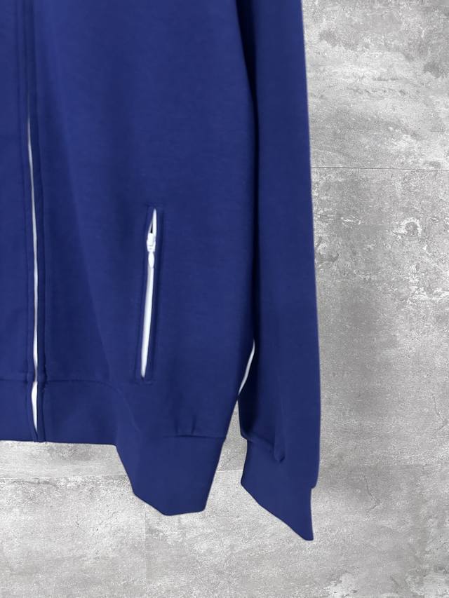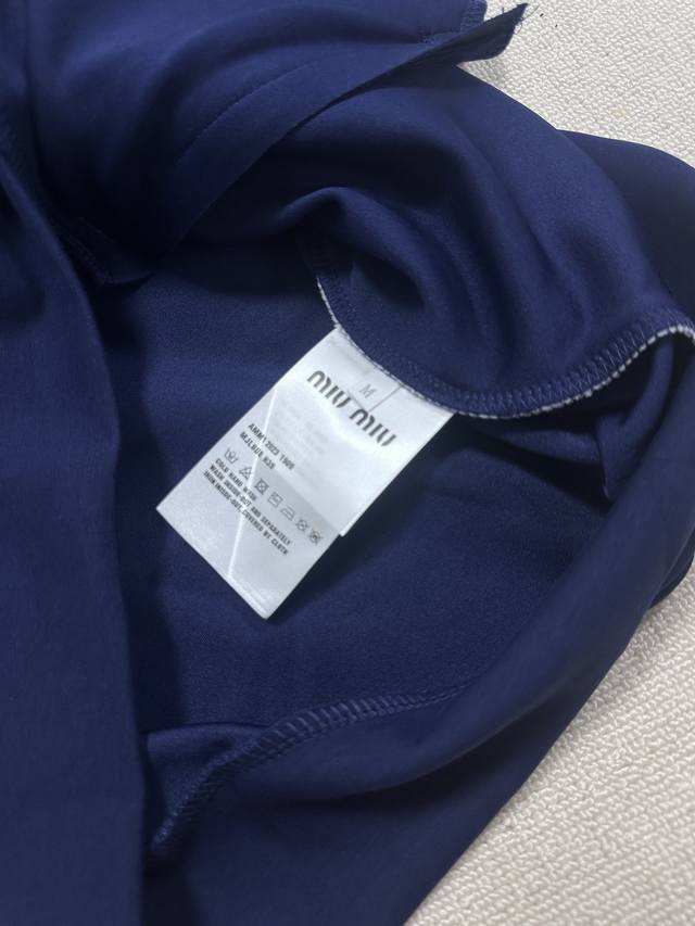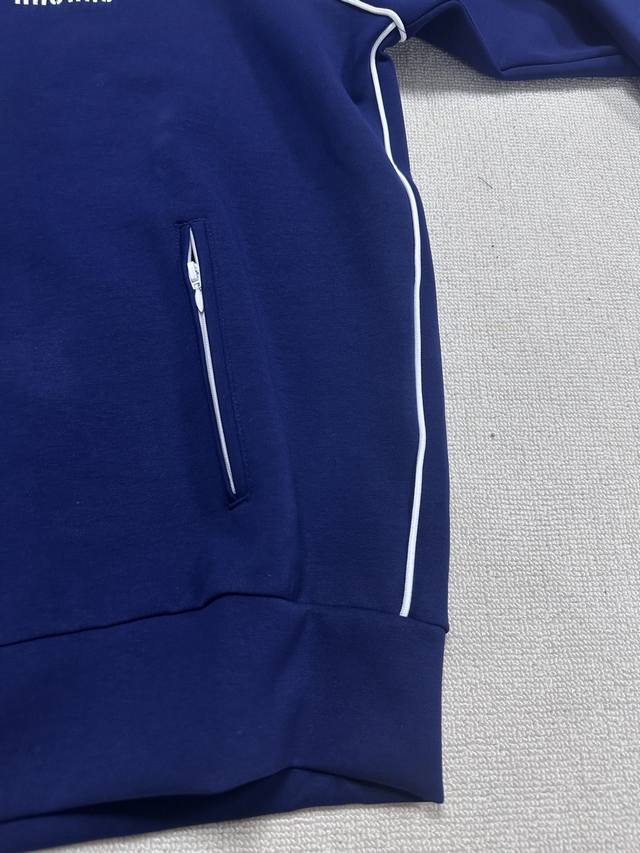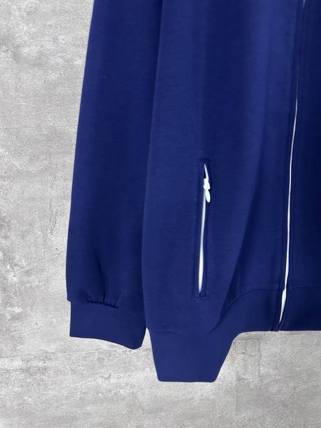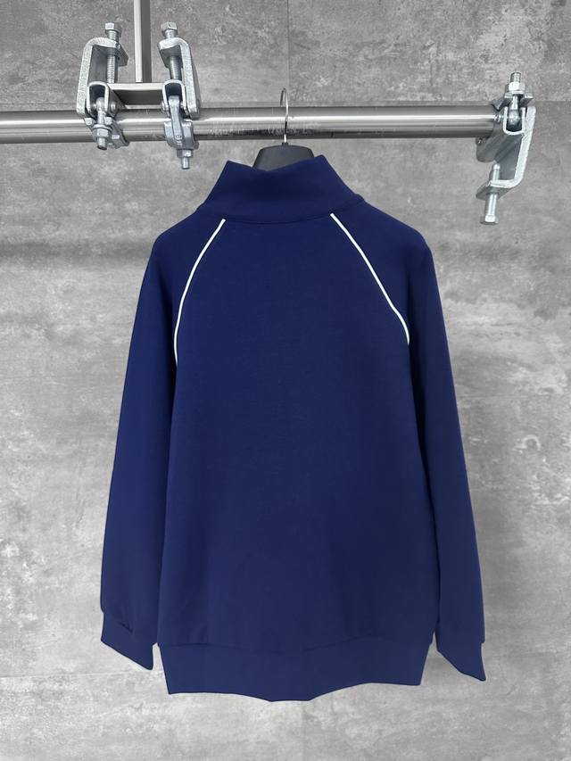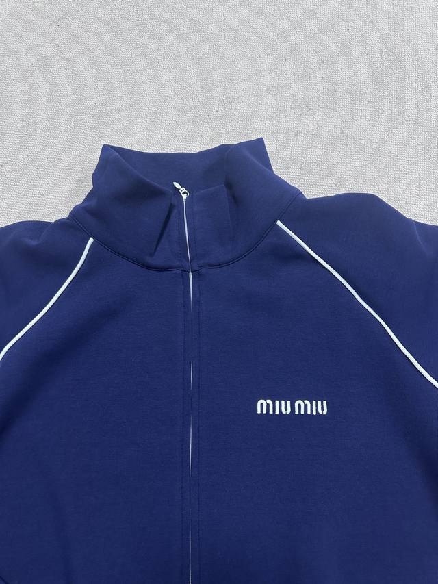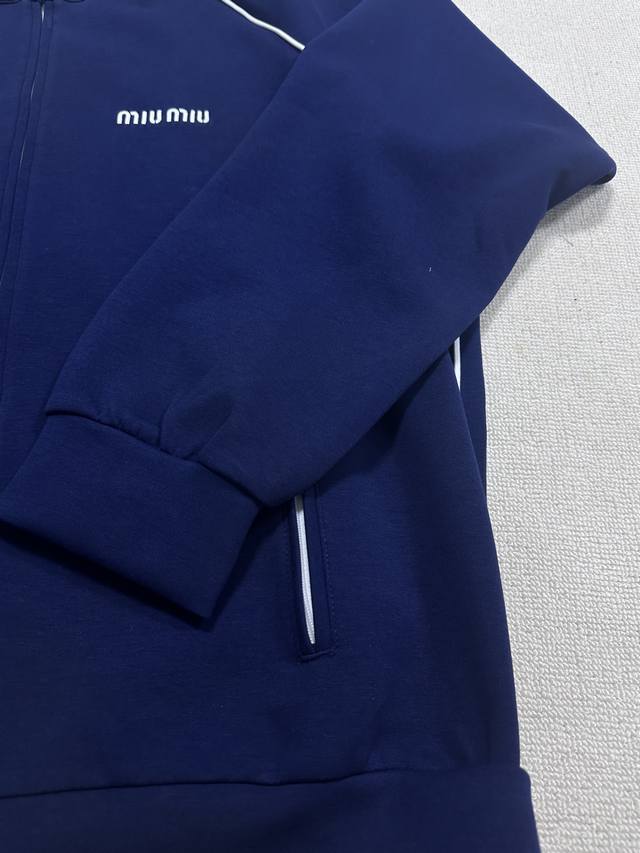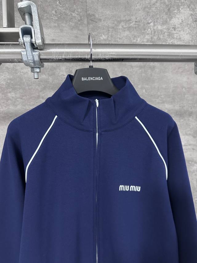 Miu Miu 2025 New Letter Embroidered Logo Zip-Up Sweater, Preppy Style, Unisex, Navy Blue. Sizes: S, M, L. When Miu Miu's design philosophy and style embody its blurred gender boundaries, it indicates an exploration of a wider audience, including men. This zip-up stand-collar cardigan is a prime example, featuring both male and female models. It exudes a strong retro vibe, with a casual, relaxed cut, a straight silhouette, and 400g Mamba cotton fabric. The casual zip-up design features contrasting raglan sleeves with open stitching at the armholes
