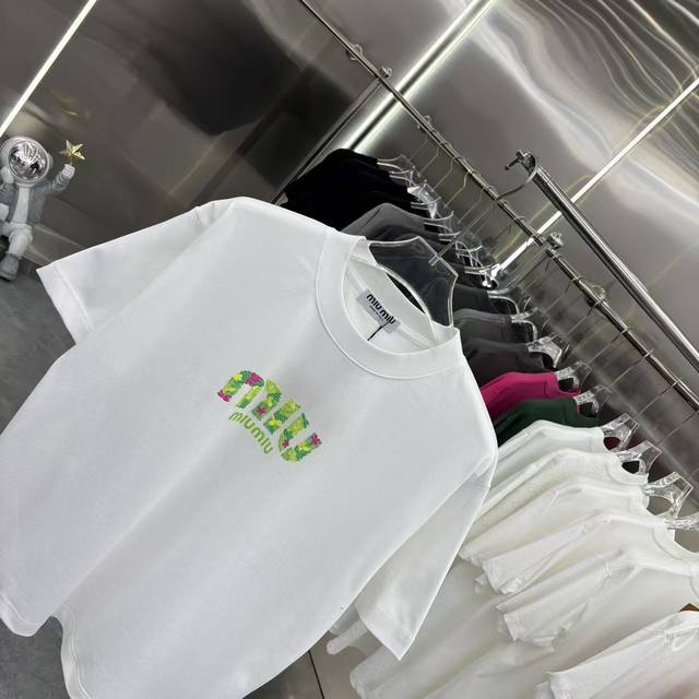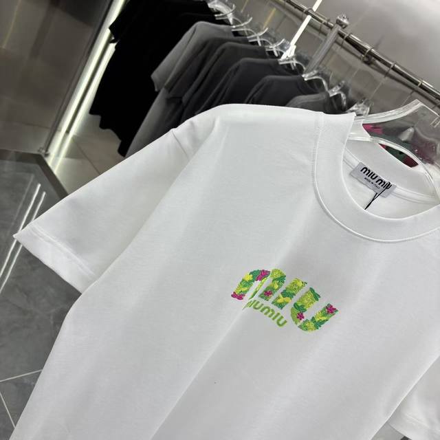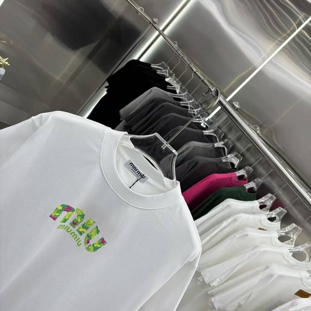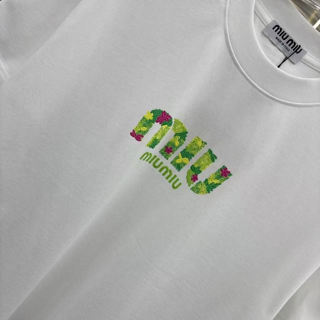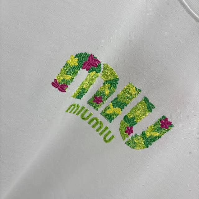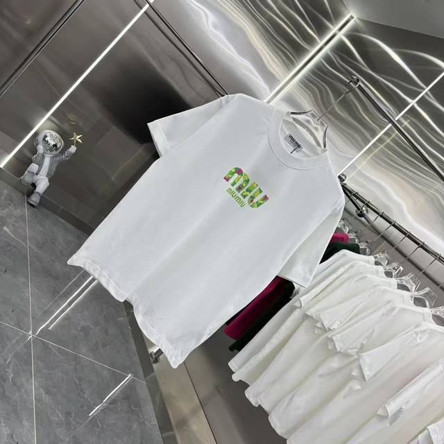 Miu Miu 2026 Spring/Summer New Personalized Engraved Lettering + Flocked Crew Neck Short Sleeve T-Shirt, Super Comfortable, Unisex, Sizes S, M, L, XL, XL, Available in Black, White, and Green.