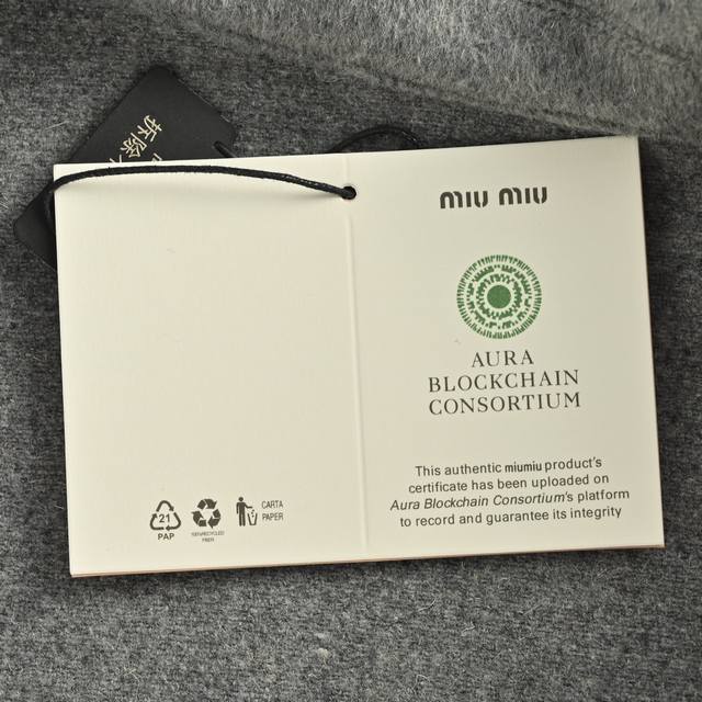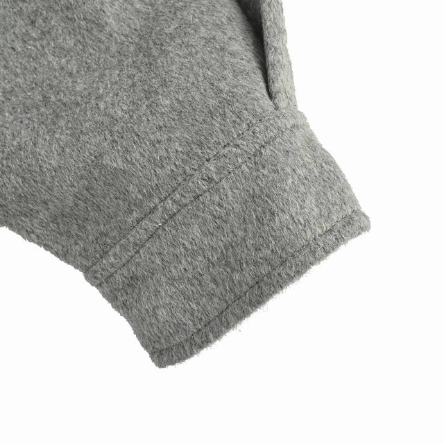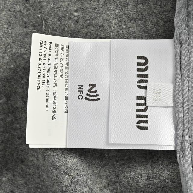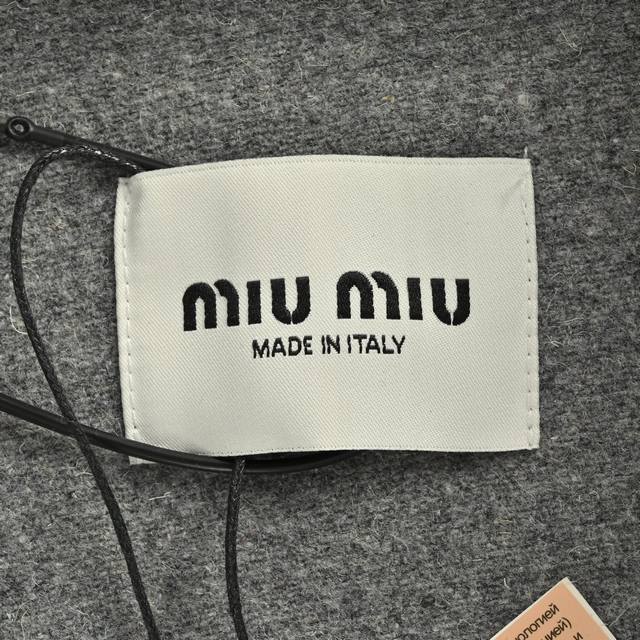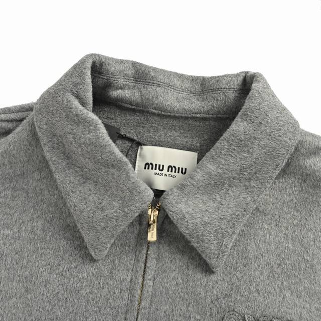 ). The fabric is 80% cashmere and 20% polyester. The material weighs approximately 620 grams. The double-sided cashmere fabric provides extra warmth. Cashmere has always been a leading representative of high-end clothing for outerwear. The embroidery features the Miu Miu brand logo on the chest, achieved through laser burning followed by manual measurement and stitching, then computer-aided placement to ensure a secure bond. The zipper is electroplated gold with a size 5 double zipper pull. The zipper teeth are electroplated gold European style. The embroidered buttons are genuine horn buttons, each with a unique pattern. (