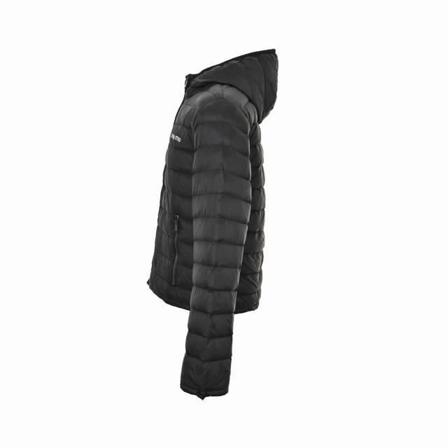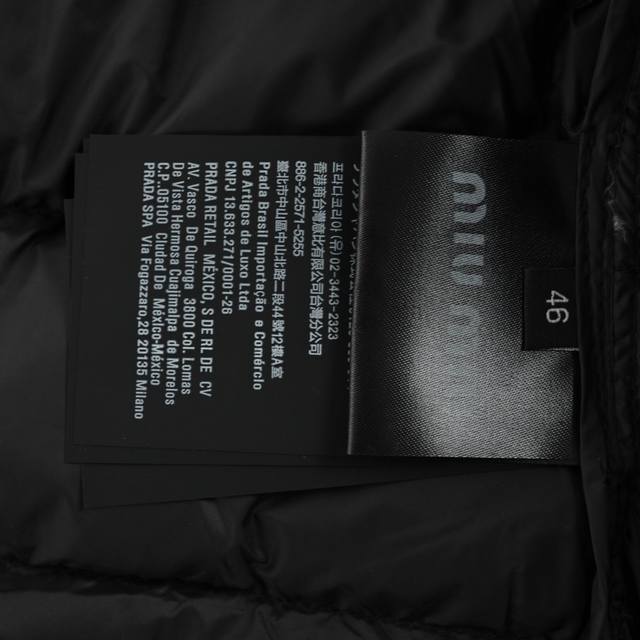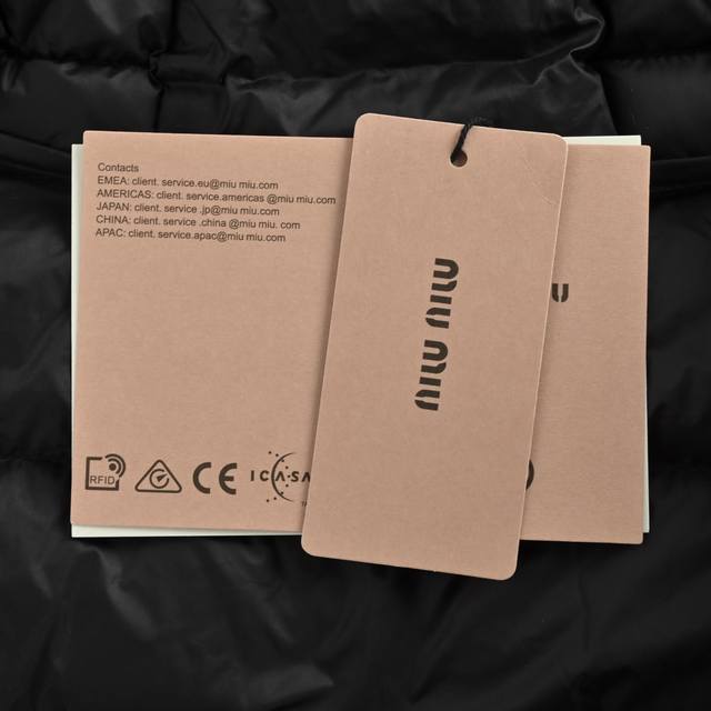 Miu Miu Hooded Down Jacket - Core Inner Filling: 90% Pure White Duck Down (Guangdong Inspection and Quarantine Certification). Made with high-count, high-density woven fabric. "High-count" refers to extremely fine yarns, giving the fabric a delicate, soft touch and a premium feel; "high-density" refers to an extremely high number of warp and weft threads per unit area, fundamentally forming a strong physical barrier against cold winds, effectively preventing the down lining from escaping. Coating Treatment: An advanced water-repellent coating is applied to the dense fabric base. This coating causes water droplets to bead up on the fabric surface and roll off, rather than immediately penetrating. This invisible shield allows the garment to easily handle everyday light rain, snow, and accidental splashes, ensuring the inside remains dry and comfortable. The bonding process between the coating and the fabric requires extremely high precision, ensuring durable waterproof performance without compromising the fabric's original breathability and feel. The core filling is 90g of 90% pure white duck down certified by the Guangzhou Institute of Fiber Products Testing and Research, a national authoritative institution. This certification is irrefutable proof of quality, emphasizing authenticity. The 90% pure white duck down clusters are the core of the down, like dandelion fluff, rather than the much less warm feathers. This extremely high 90% content means it has unparalleled heat-retaining capacity, achieving ultimate warmth with an ultra-lightweight design. It is also highly compressible, making it easy to pack. Custom mold design: Instead of using generic zipper hardware, a special mold was developed for this down jacket, casting matching zipper teeth and pulls. This means that the zipper's size, feel, tooth shape, and smoothness of operation have all been precisely adjusted to perfectly match the fabric thickness and garment design. All workmanship is done in a standardized workshop of a large factory. All edges, such as the neckline, armholes, and hem, are finished with a fine binding technique. This typically involves wrapping the raw edges of the garment with a bias-cut strip of fabric, either the same material or a matching satin, and then securing it with stitching. Custom-made accessories include three labels. Unisex style,