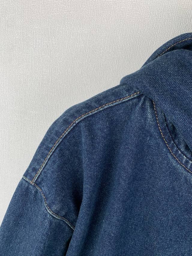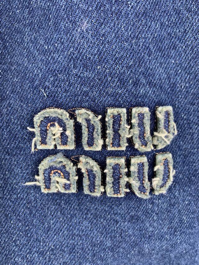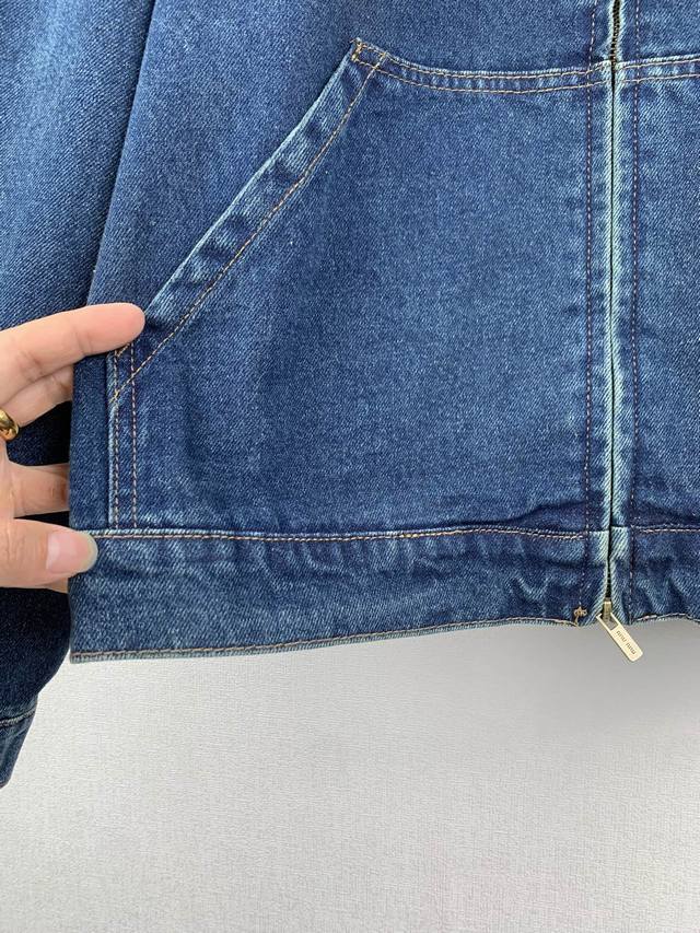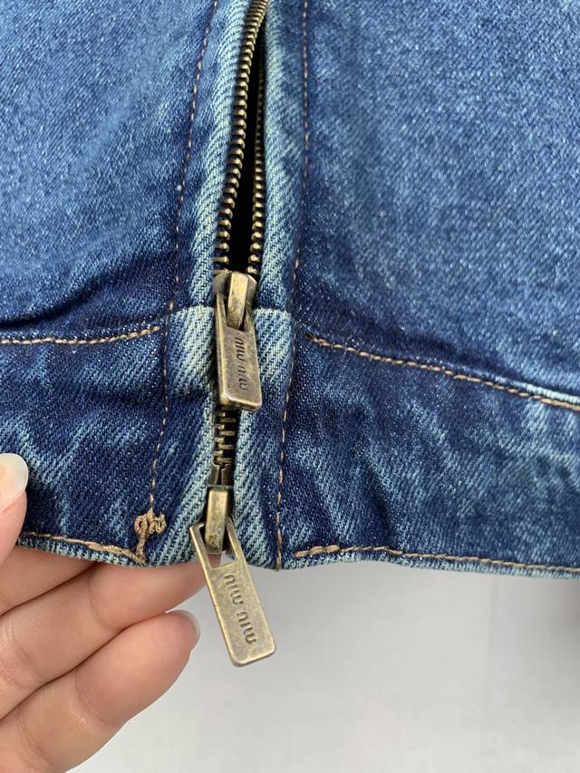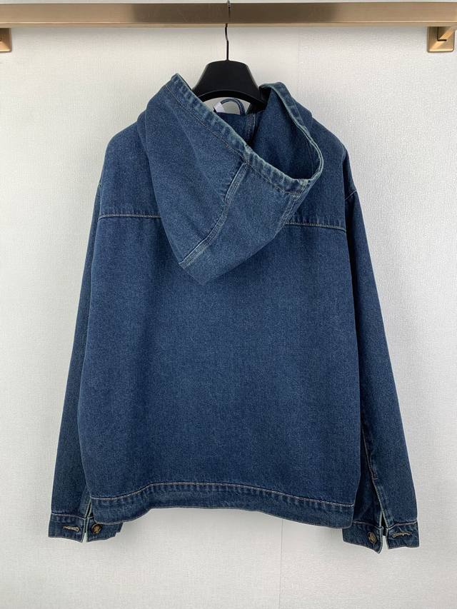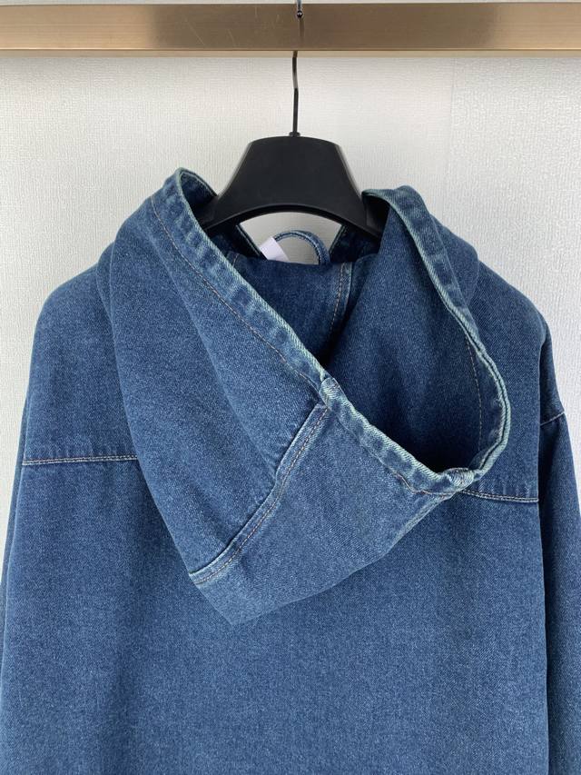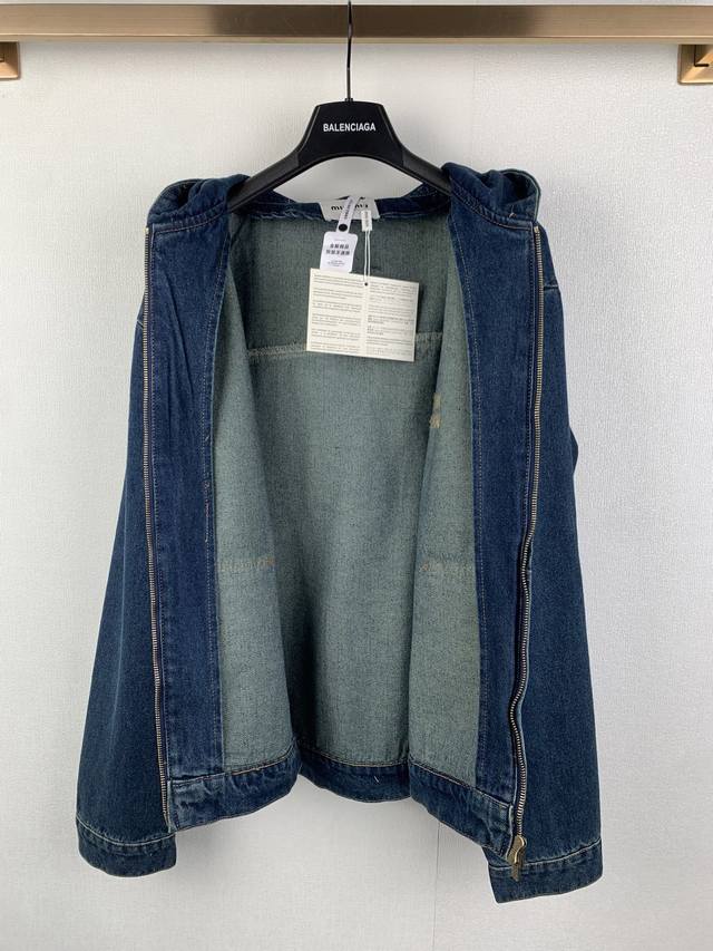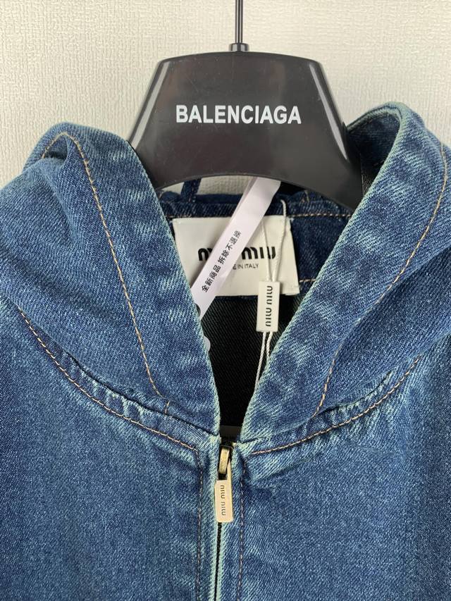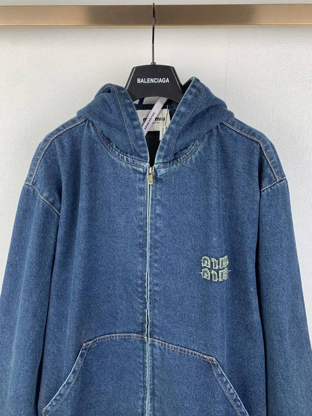 Miu Miu Hooded Embroidered Solid Color Long-Sleeve Zipper Denim Jacket. Authentic product purchased for 30500 RMB. Made with custom-dyed 12*12 celadon denim fabric. Finished garment washed and faded. Imported embroidery. Custom 1:1 zipper, buttons, and label. Loose fit. Sizes: 36, 38, 40, 42.