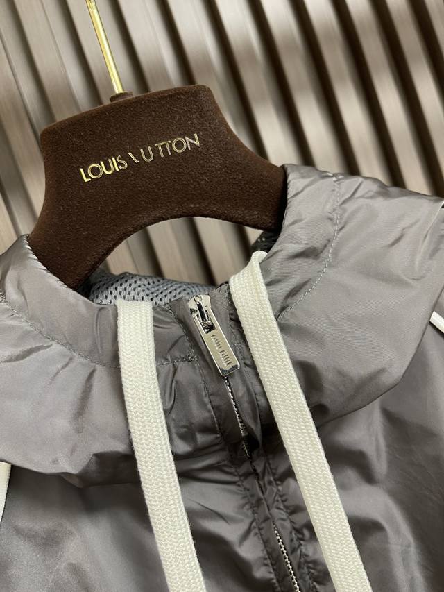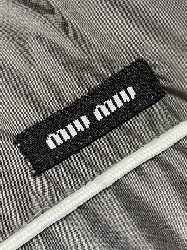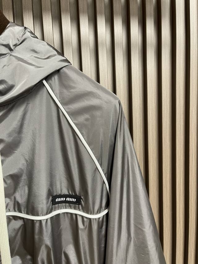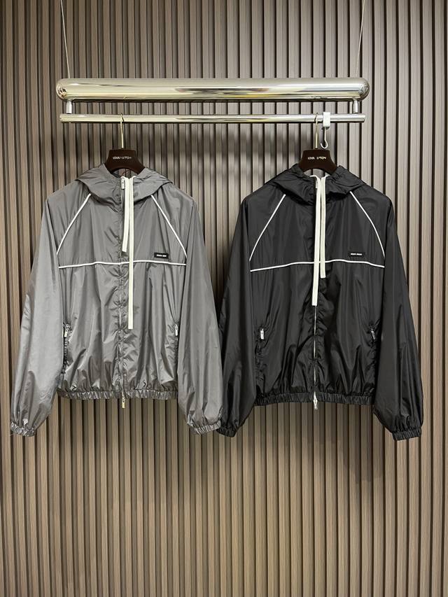 Miu Miu Zip-Up Hooded Jacket. Made with custom-woven cold-pressed microfiber nylon, this jacket is lightweight, delicate, comfortable, and skin-friendly. The classic black color scheme is a deep and sophisticated blend of elegance and understated luxury. A striking Miu Miu logo patch adorns the chest, showcasing the brand's signature refinement and elegance. The hood creates a relaxed and casual vibe. The meticulously crafted white piping adds a finishing touch, achieving perfect visual balance. A trendsetter, the jacket features straight and delicate stitching, a soft and comfortable fabric, and consistent color for a stylish look. Suitable for various occasions, this jacket includes custom accessories and all three tags. Unisex! Sizes: 36-38-40-42 S-XL DDD