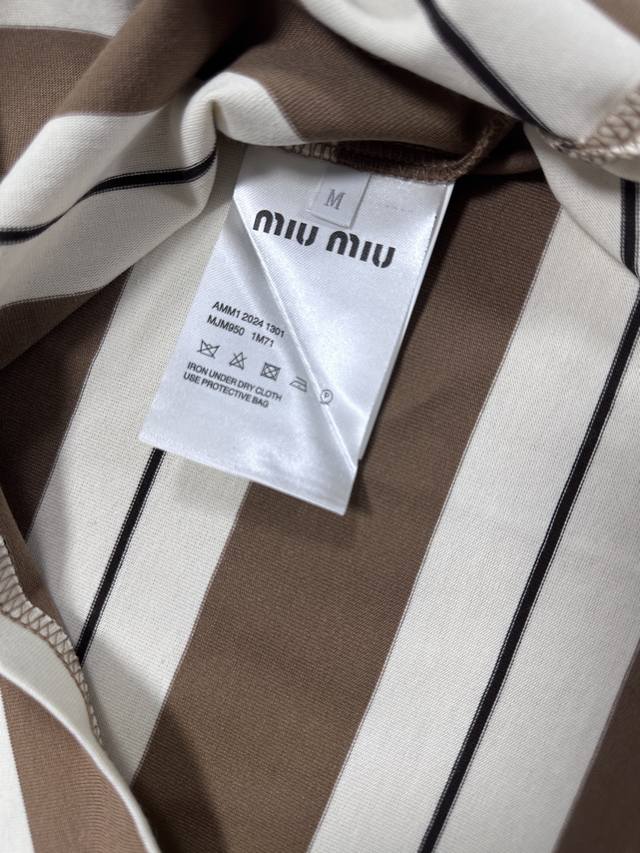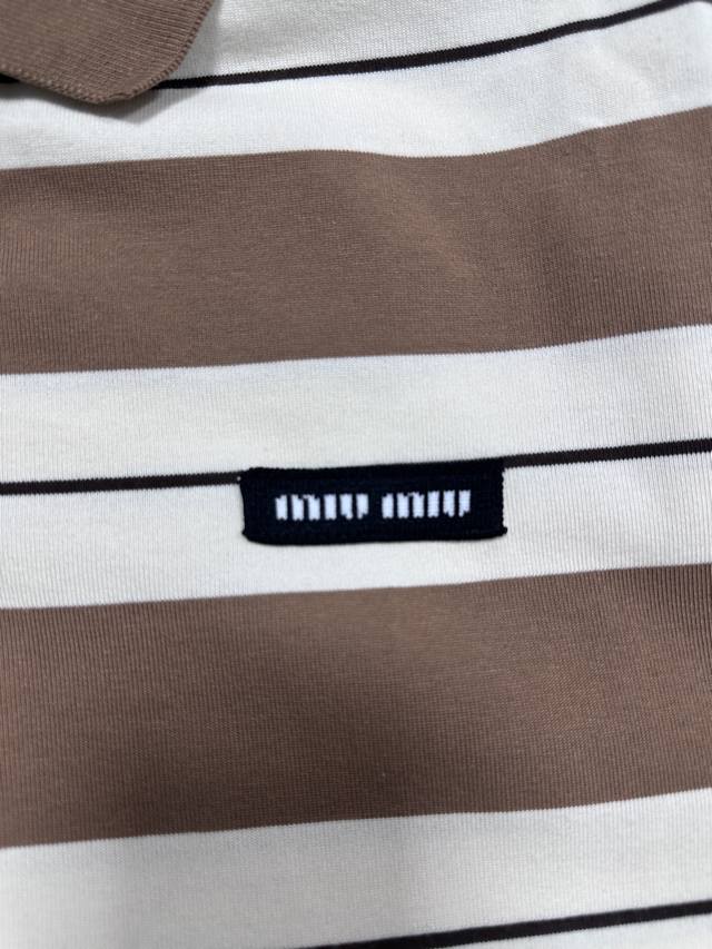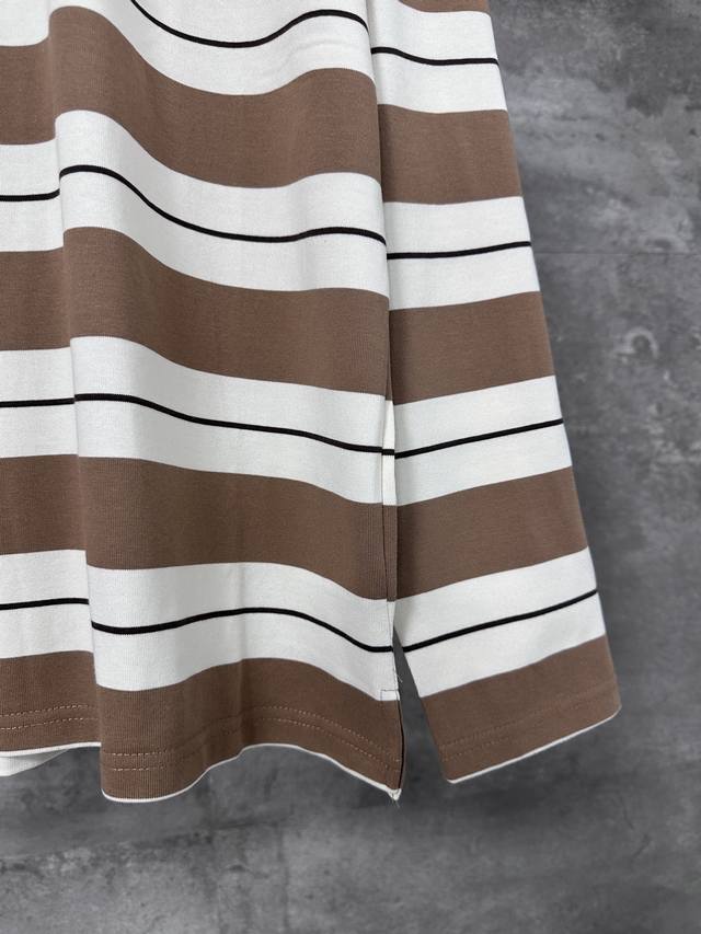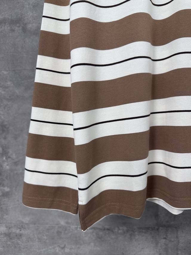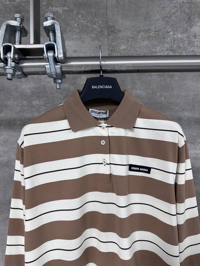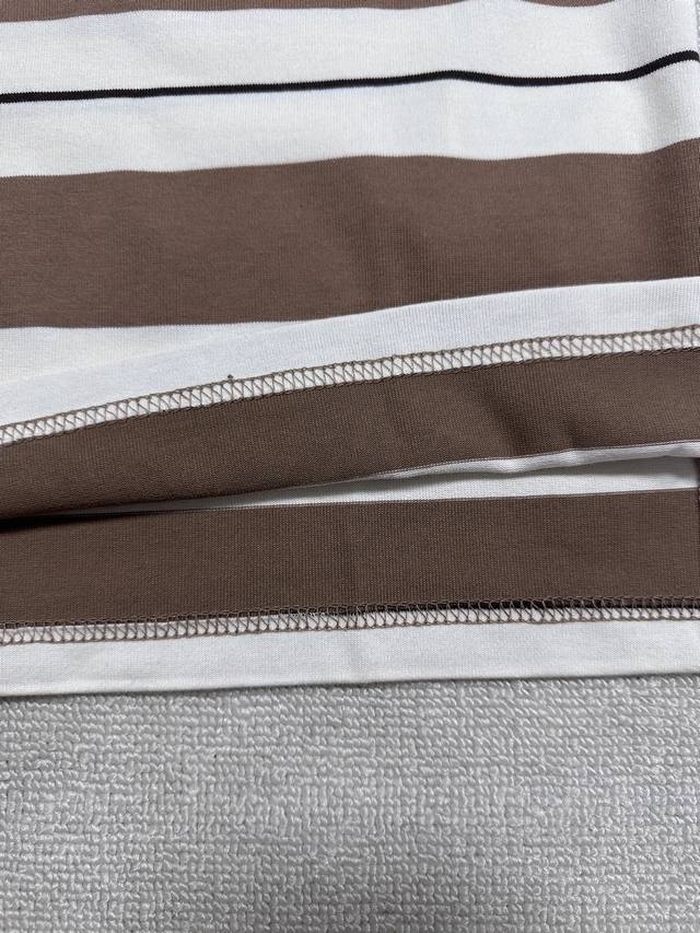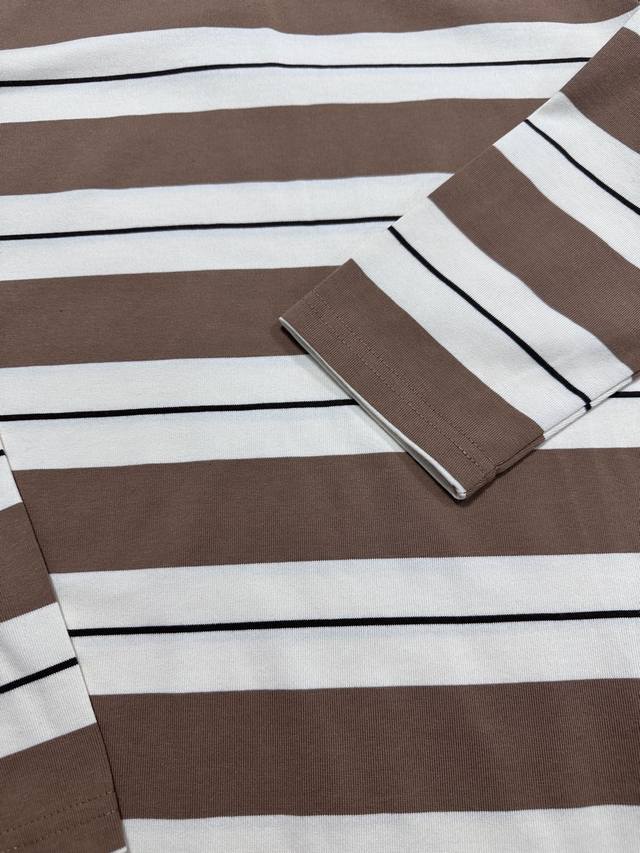 Miumiu 25Ss Color Block Striped Crew Neck Long Sleeve with Logo on Chest, Preppy Style. Made with 60-count double-ply yarn: Utilizing 60S 200G high-count combed cotton, the double-ply twisting process enhances yarn strength, making the fabric more delicate, crisp, and wrinkle-resistant while maintaining a soft, skin-friendly feel. Plain knit construction: Classic Jersey knit provides excellent elasticity and drape, suitable for a slim fit, and the consistent texture on both sides ensures precise stripe alignment. From yarn ratio and density to weight, everything is customized according to the original design requirements to ensure color saturation and stripe clarity. Piece alignment: During cutting, the fabric stripes must be strictly aligned at seams such as the front and back pieces, armholes, and side seams. Shoulder lines and armholes use bias cutting to reduce distortion; due to the extremely high alignment requirements, fabric utilization may be as low as 60%, compared to 85% for ordinary ready-to-wear garments, significantly increasing costs. Size: SML