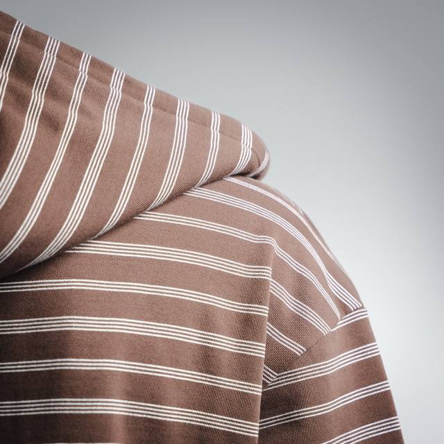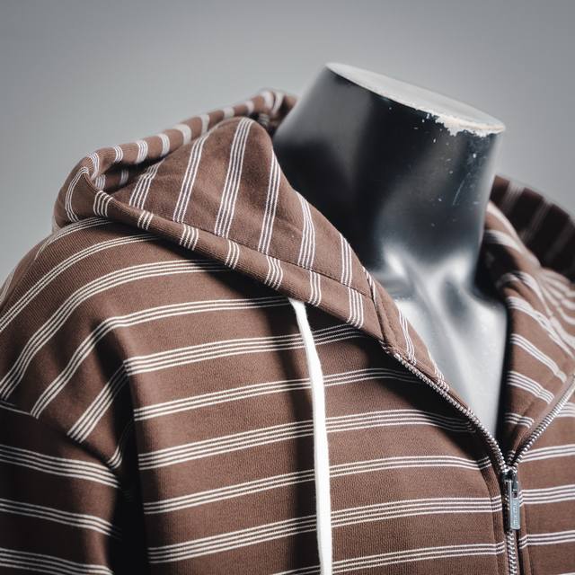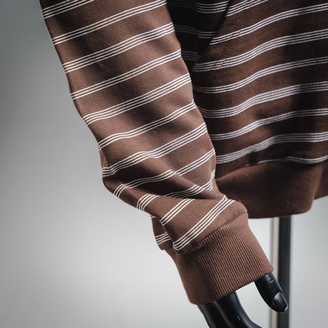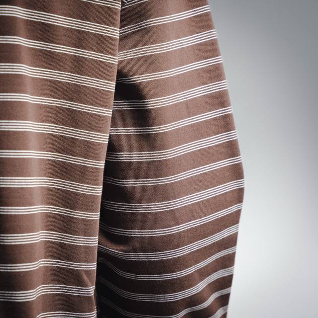 ) Made with 50-count double-ply worsted cotton yarn, the yarn is fine and strong, ensuring the fabric is lightweight, smooth, and resistant to deformation. A unique striped weave was developed for this item, achieving a three-dimensional texture through precise adjustment of warp and weft yarn density, requiring professional equipment and strict quality control. The striped yarns are pre-dyed in batches, then color-matched to ensure color saturation and clear stripe boundaries. The neckline is hand-stitched with a special curved needle, connecting the ribbing of the neckline to the inner loops of the garment body, leaving no visible stitches. The tension of the stitching is manually controlled to maintain the natural curve and elasticity of the neckline, avoiding the stiffness caused by machine sewing. The stripes and checks are precisely aligned before cutting, with an error controlled within 1mm, ensuring continuous stripes without gaps after splicing. Due to the stringent pattern matching requirements, the fabric utilization rate is only 60%-70%, far exceeding the 90% of ordinary cut pieces, significantly increasing costs.