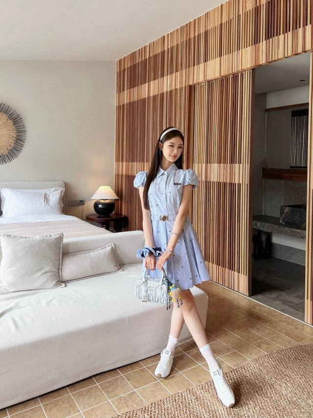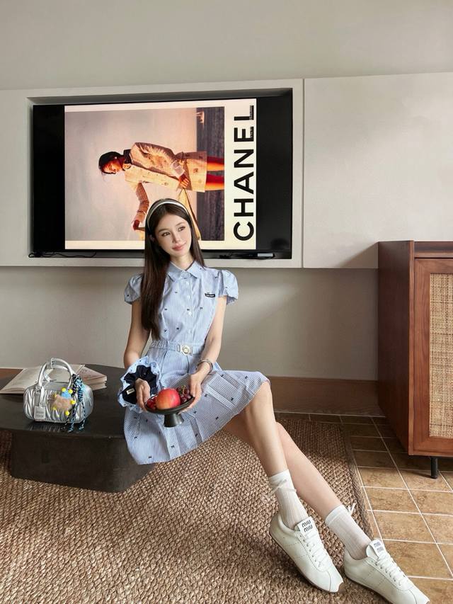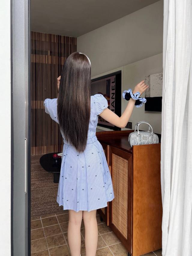 Miumiu Miu Miu customized letter small label bow striped lapel pleated shirt dress with belt