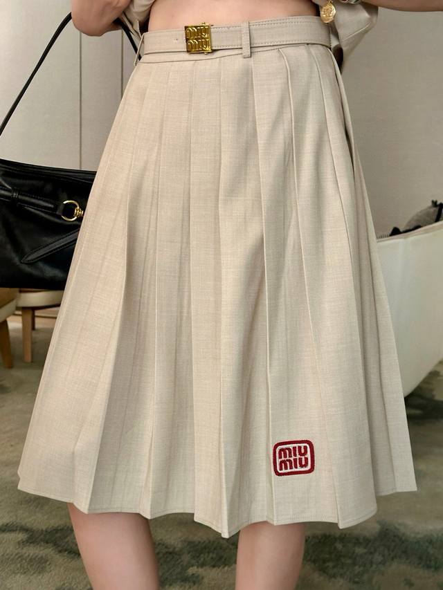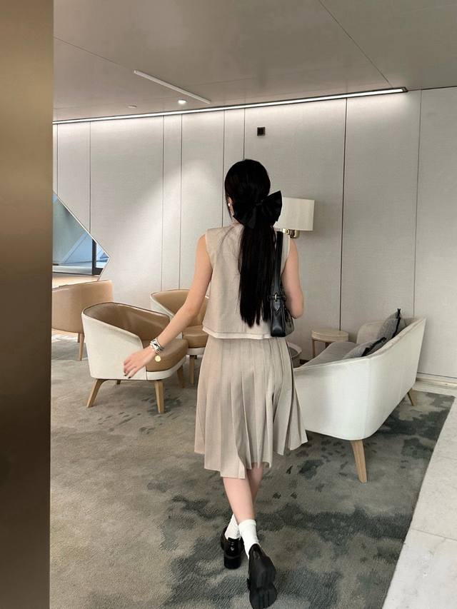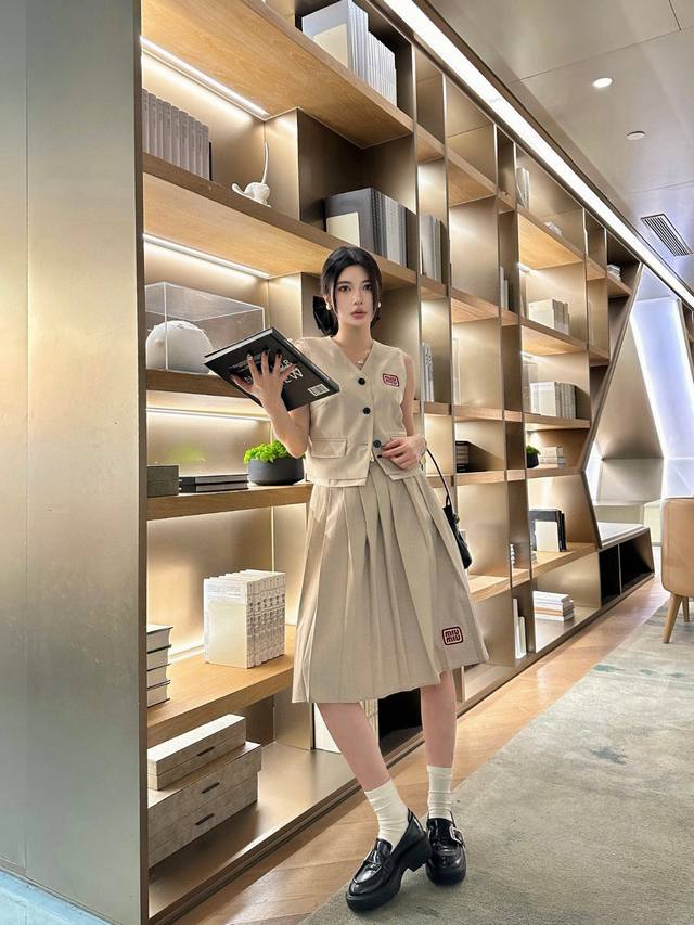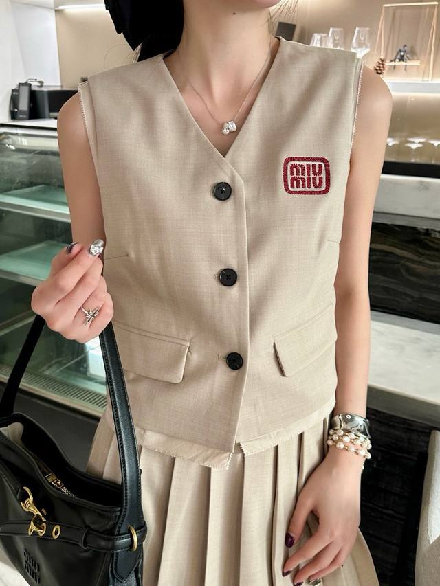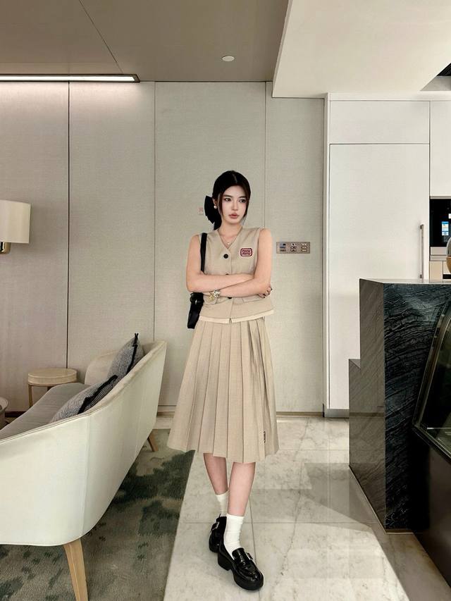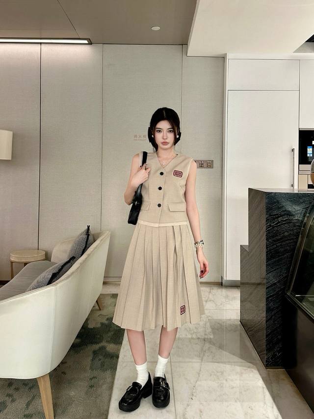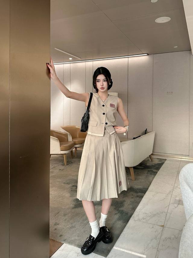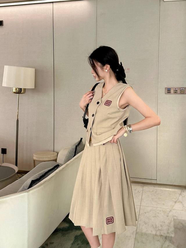 Miumiu Miu Miu letter square embroidery V-neck vest pleated skirt suit with belt