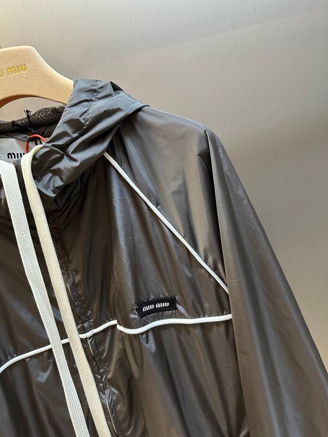Miumiu Nylon Zipper Hooded Jacket DDD. Made of custom cold-pressed, intelligent porous nylon fabric, the jacket features a striking Miuiu logo patch on the chest, showcasing the brand's consistent sophistication and elegance. The hood flares gently, creating a relaxed and casual vibe, while meticulously crafted white piping adds a finishing touch, achieving perfect visual balance in harmony. A trendsetter in fashion. DDD. The jacket is sewn in one piece using a three-needle elastic waistband sewing machine. Utilizing the machine's special needle positions and feeding mechanism, the elastic band and fabric are sewn together in the same process. The three-needle design provides greater strength and even pressure distribution, ensuring a tight fit between the elastic band and fabric. DDD Size: M-3XL DDD