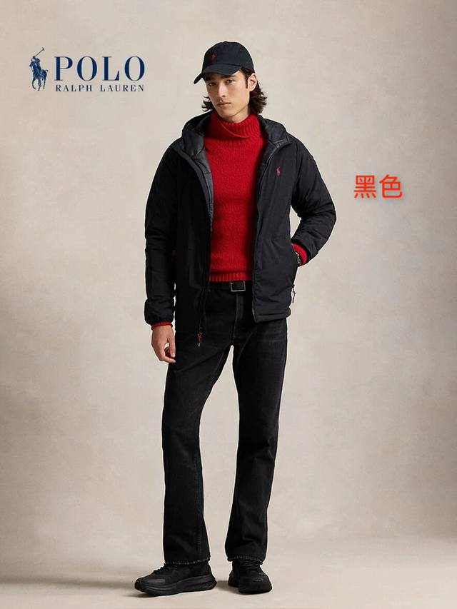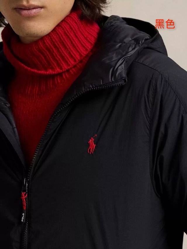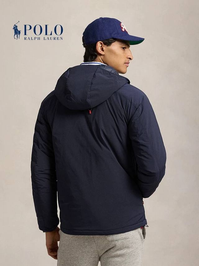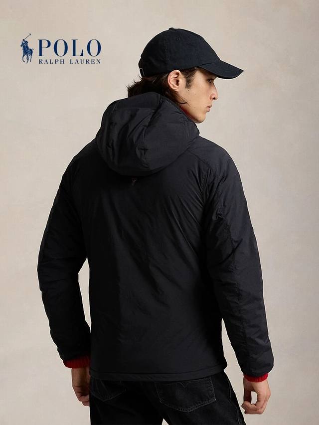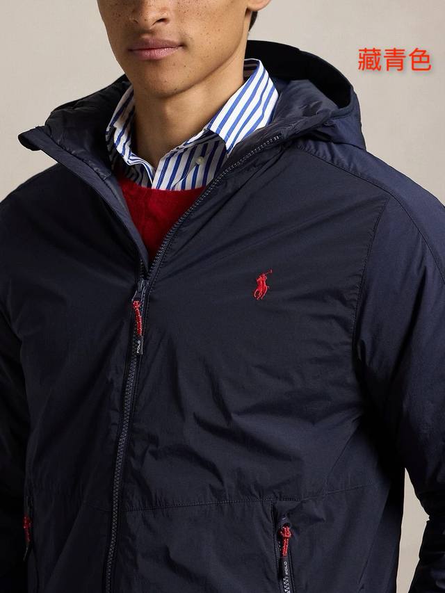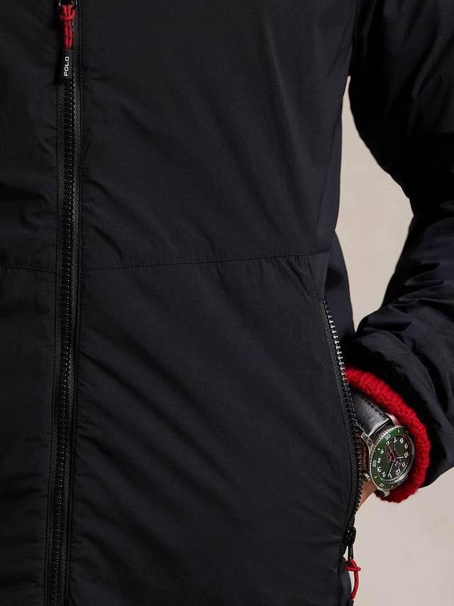 Ralph Lauren men's hooded jacket with embroidered horse logo, zippered pockets, and a windproof collar.