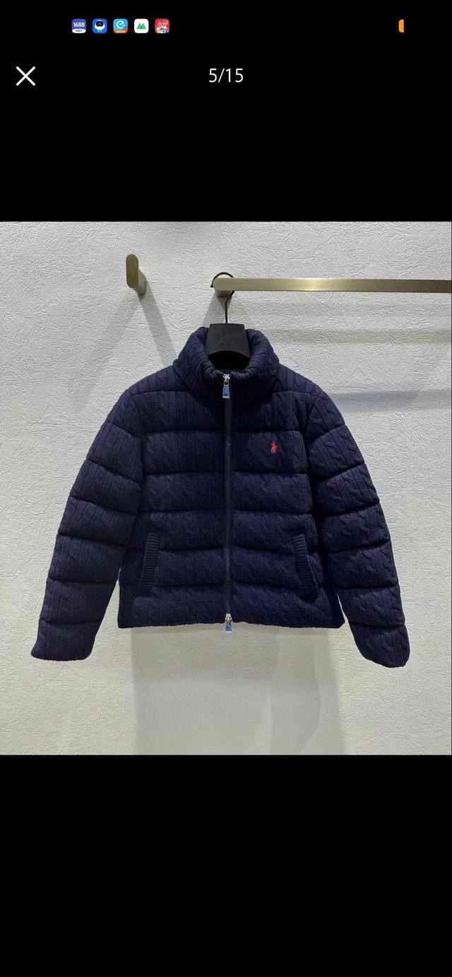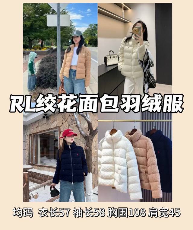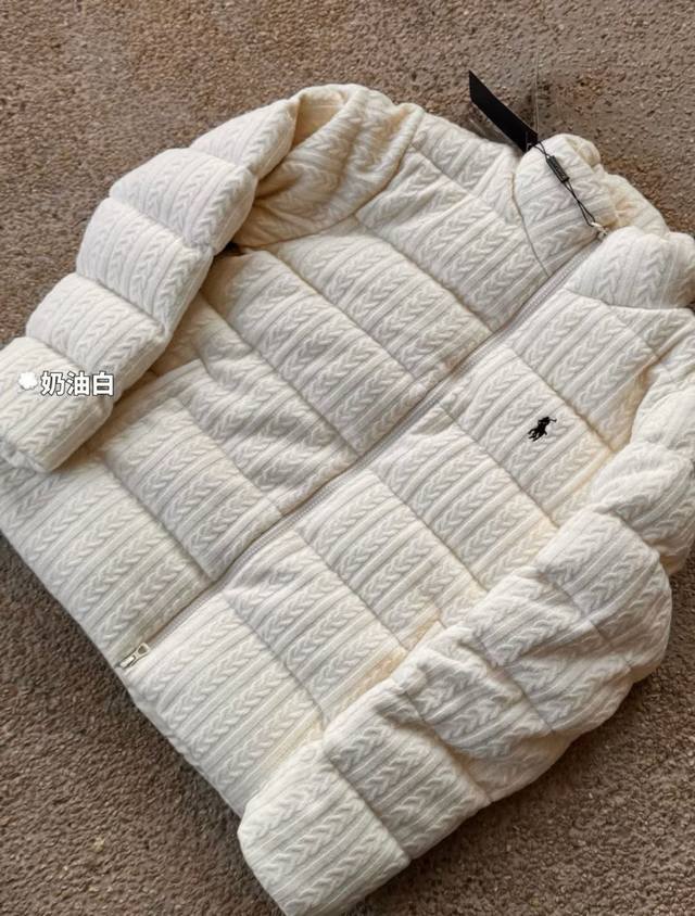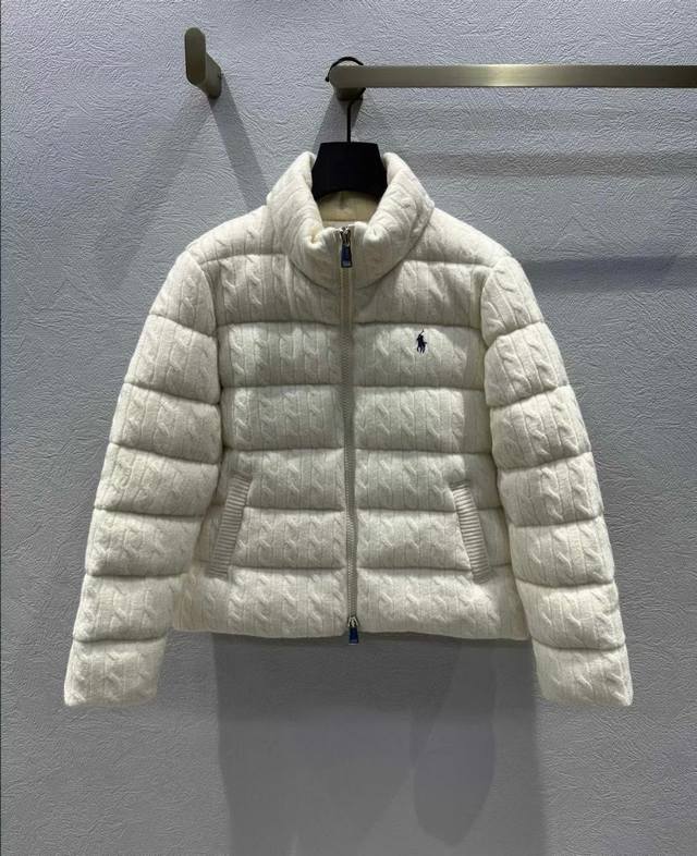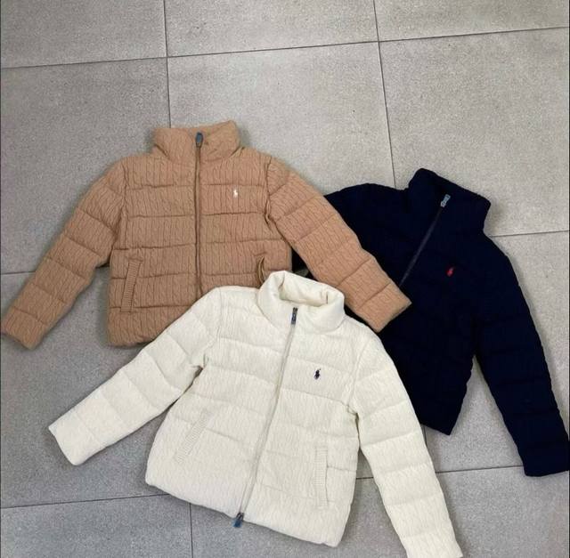 New Arrival DDD Rl Ruff Cable Knit Three-Color Down Jacket DDD Who can resist a soft and cozy down jacket in winter? DDD 90% White Duck Down, High Loft DDD Perfect Fit DDD Colors: Off-white, Navy Blue, Khaki DDD Sizes: S, M, L (see end picture) DDD