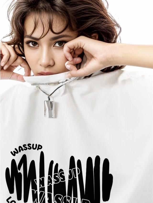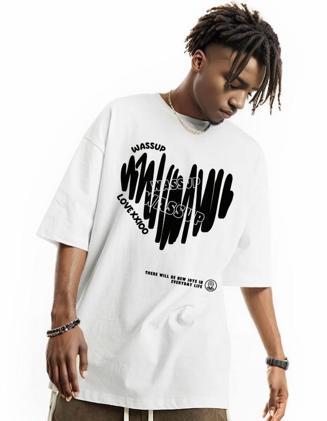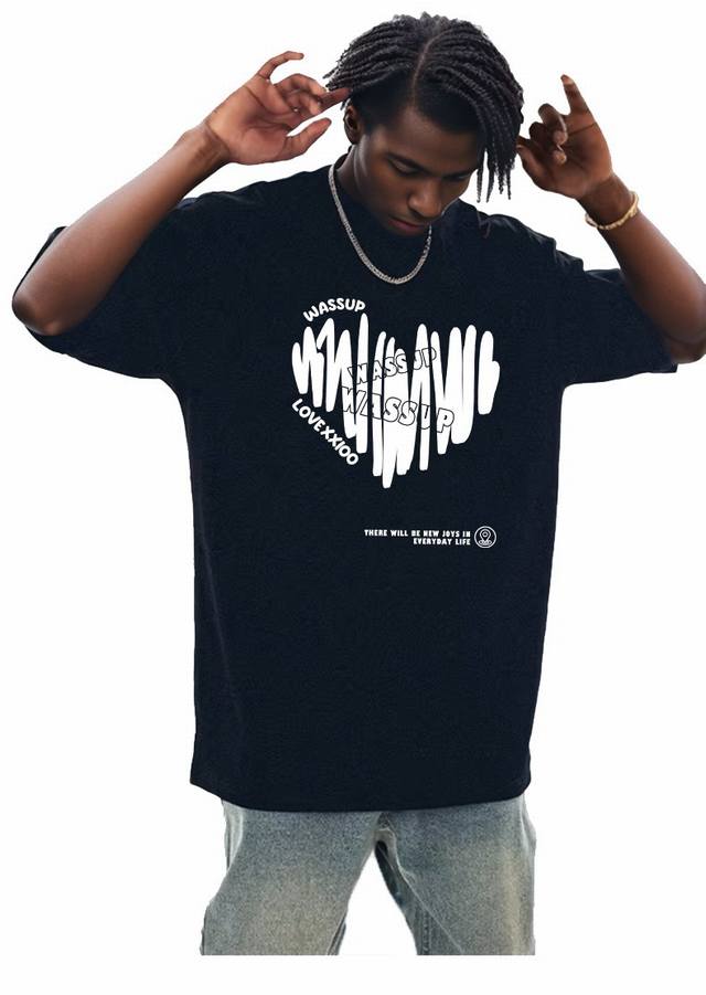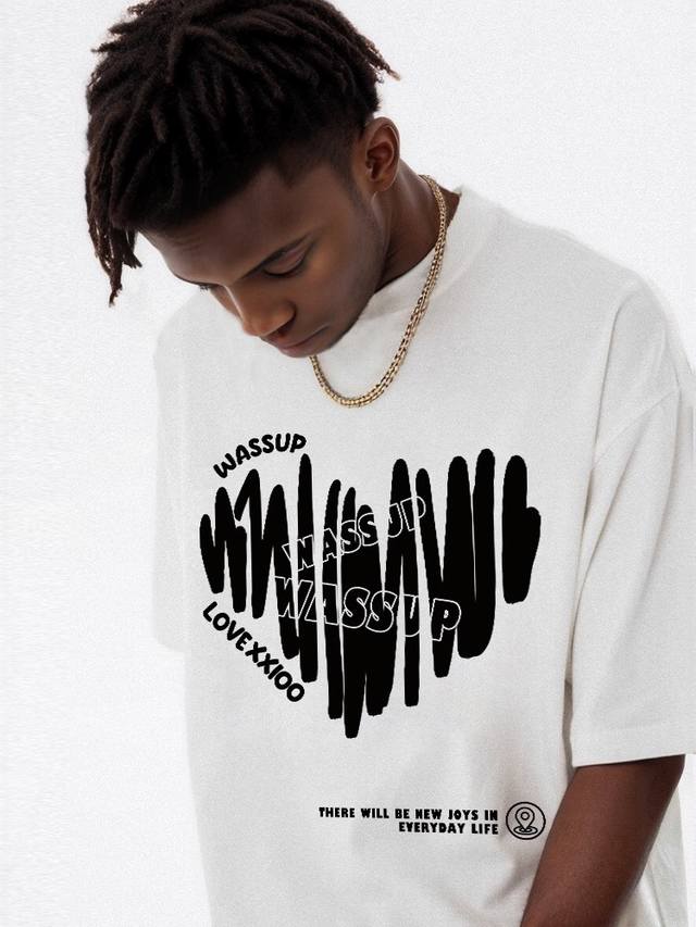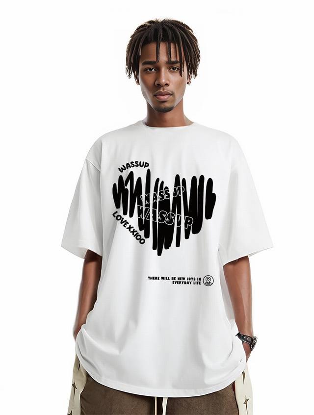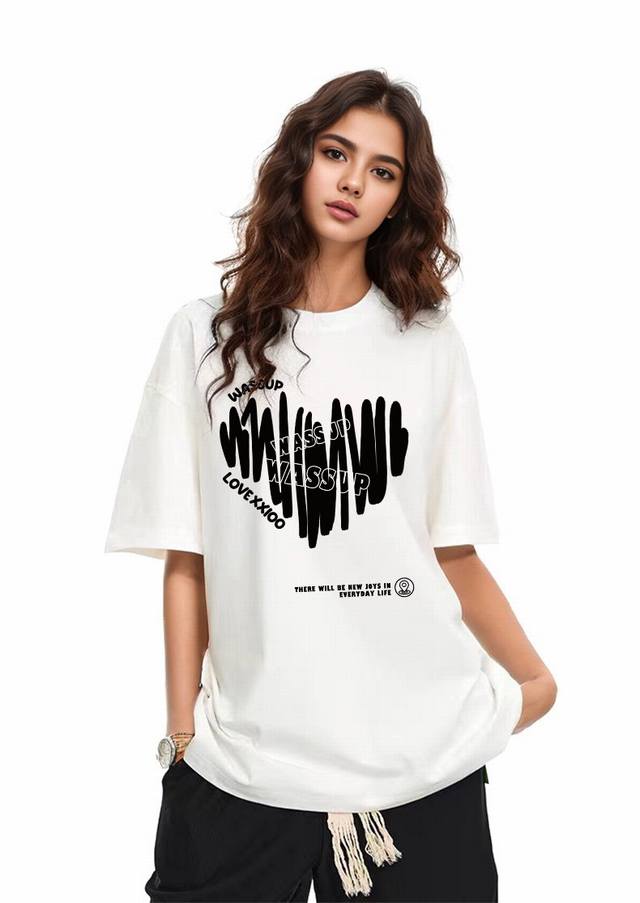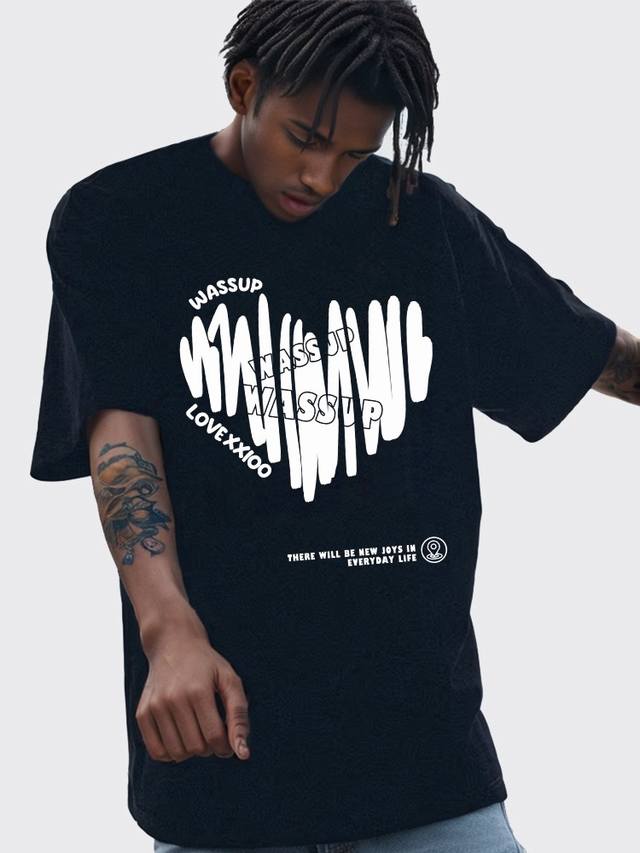 Wassup2640 New Black and White Heart Graffiti Letter Print Short-Sleeve T-Shirt for Men and Women, Spring New Loose Pure Cotton Top