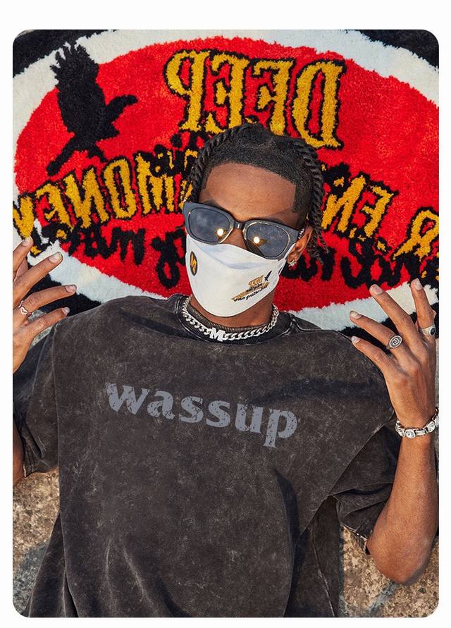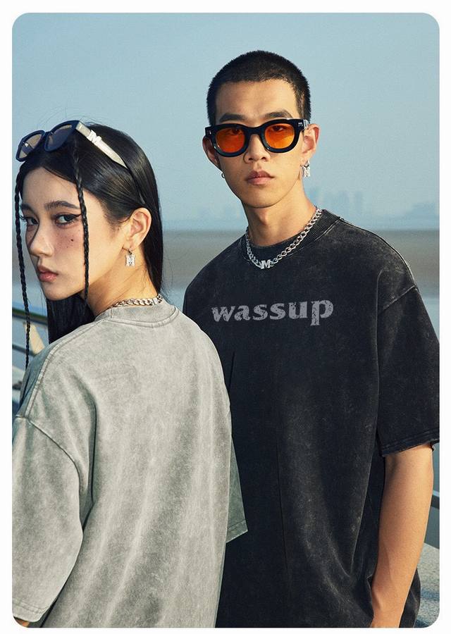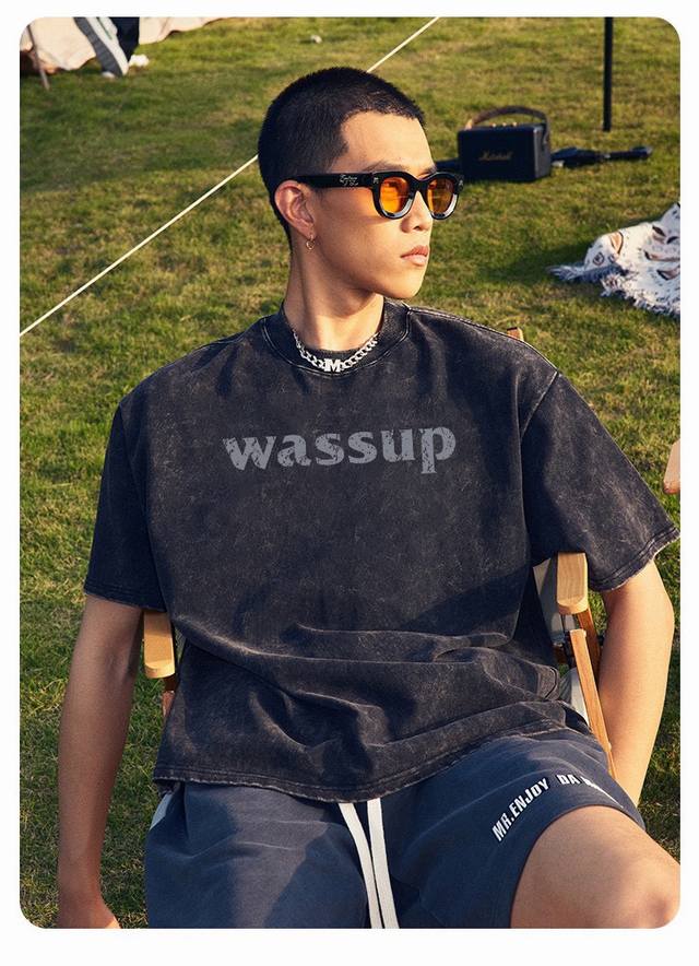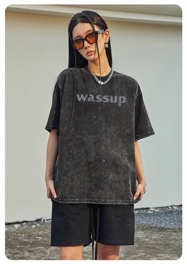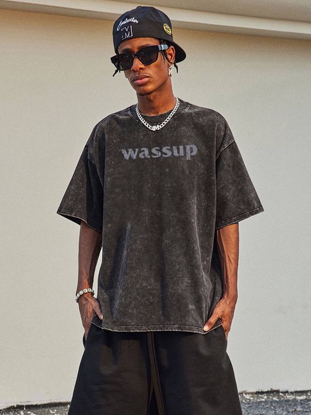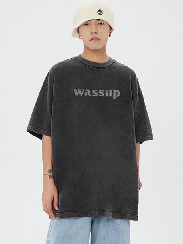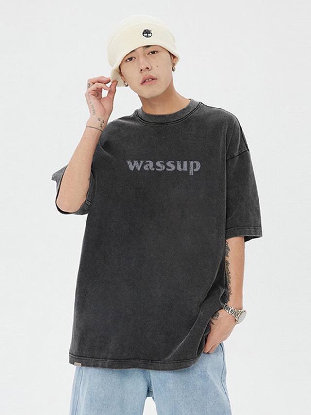 New Arrival: Upgraded Short-Sleeve Fabric, Style No.: K07. Distressed Washed Wassup Short-Sleeve T-Shirt, Crew Neck, Summer Trend, Simple Print, Solid Color, Half-Undershirt. Superb quality, unisex, couple style, simple, versatile, and classic. Color: Washed Black. Sizes: S, M, L, XL.